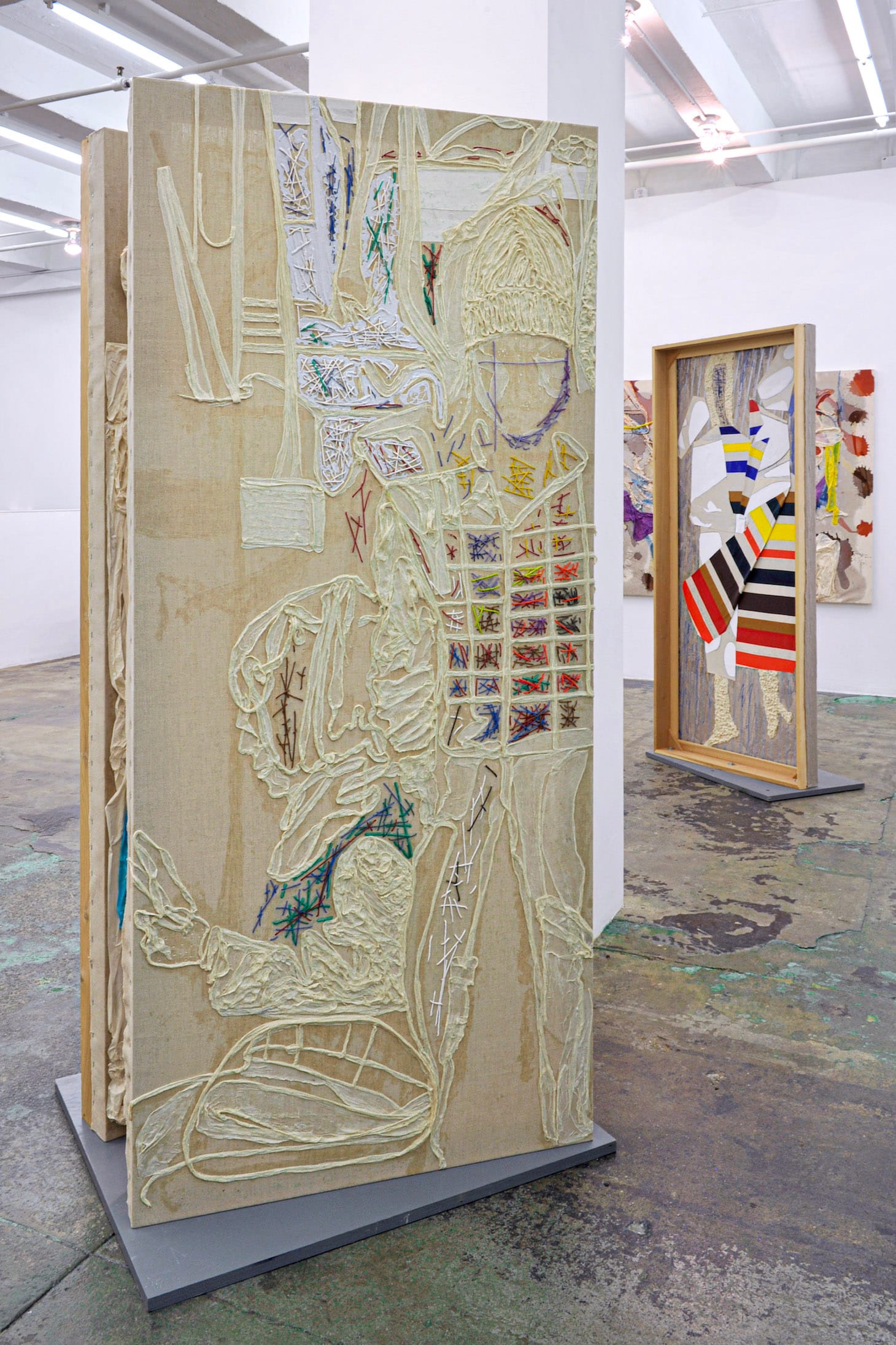 “Studio Portrait Over Time” (2016), which is made of cheesecloth, muslin, painted string, and acrylic mediums, consists of two two-sided paintings mounted on a base at a slight angle to each other. Both paintings stand over six feet high and around three feet wide, which corresponds to the personal space taken up by a standing adult. It is not quite the space we associate with social distancing, but it gives the individual breathing room, so to speak. By separating the two paintings just enough that we can look at the space between them and see what is on the obverse side, Nelson invites us to connect four different views.