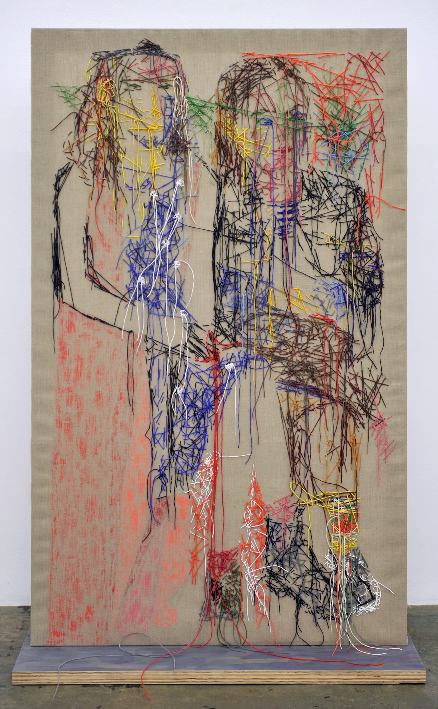 In “Riley and Olive” (2020), done primarily in painted string, Nelson uses the wood frame to upend what we think of as the front and back of a painting. On what is typically the reverse side, because of its relationship to the shallow, box-like frame, we see two young women. Seated side by side, they are larger than the painting, and extend beyond its edges.