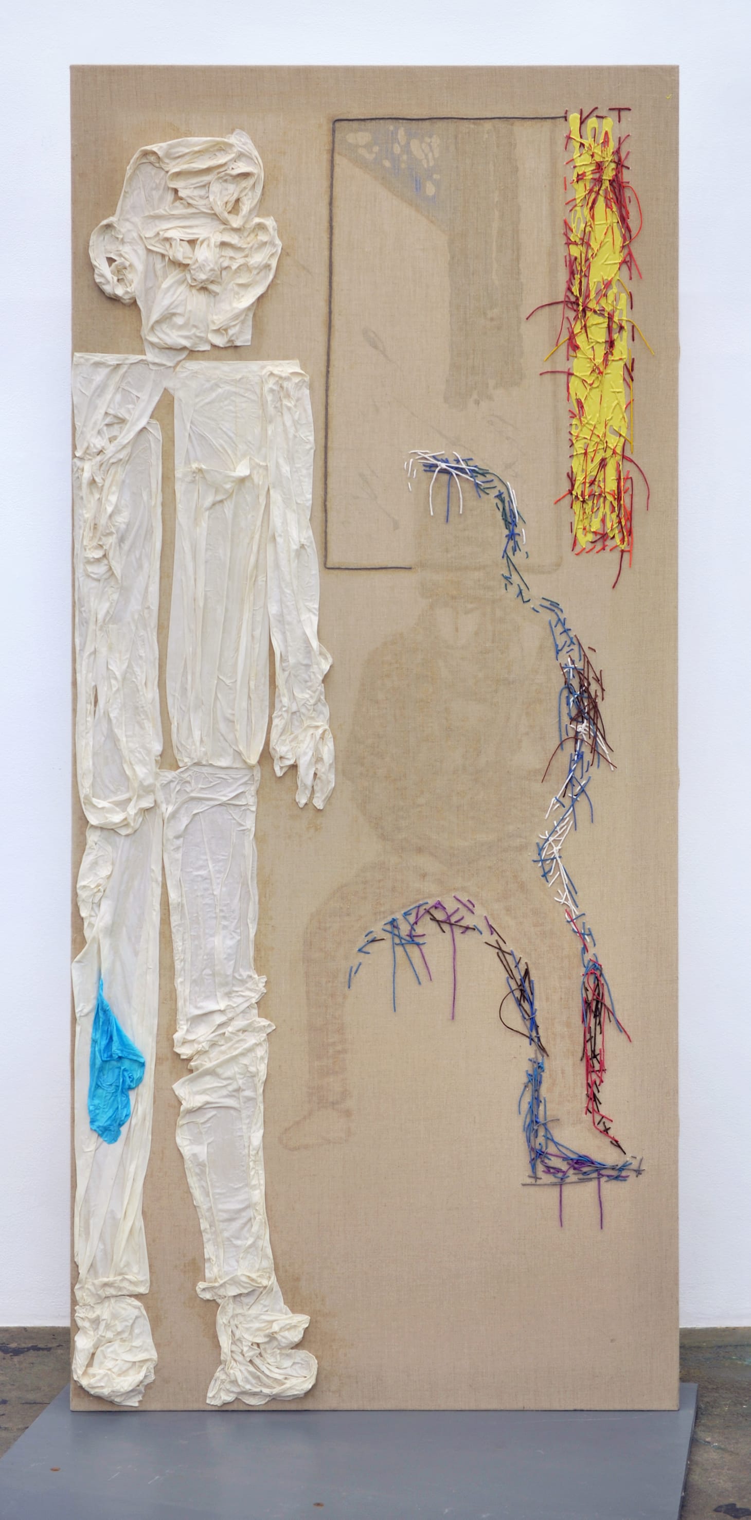 Two figures are also on the neighboring panel, on the side stretched over the support — one standing and one seated. The standing one — a featureless figure made of white cheesecloth soaked in a clear acrylic medium — is on the painting’s left side, cropped by the left edge. One of its distinguishing features is a large ear. Meanwhile, the uneven surface of this form, a result of the cheesecloth, becomes a topographical terrain.