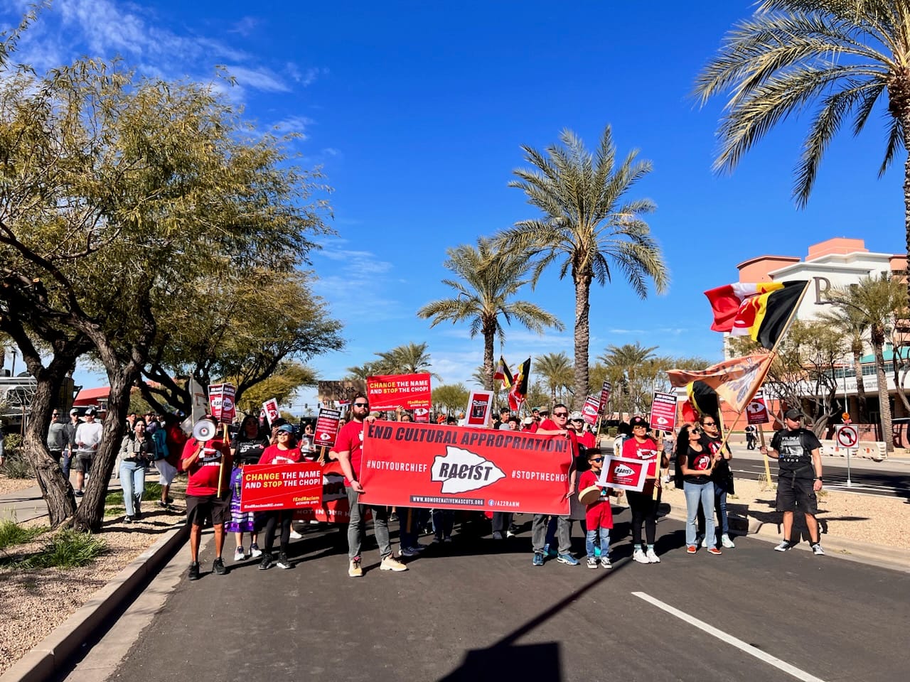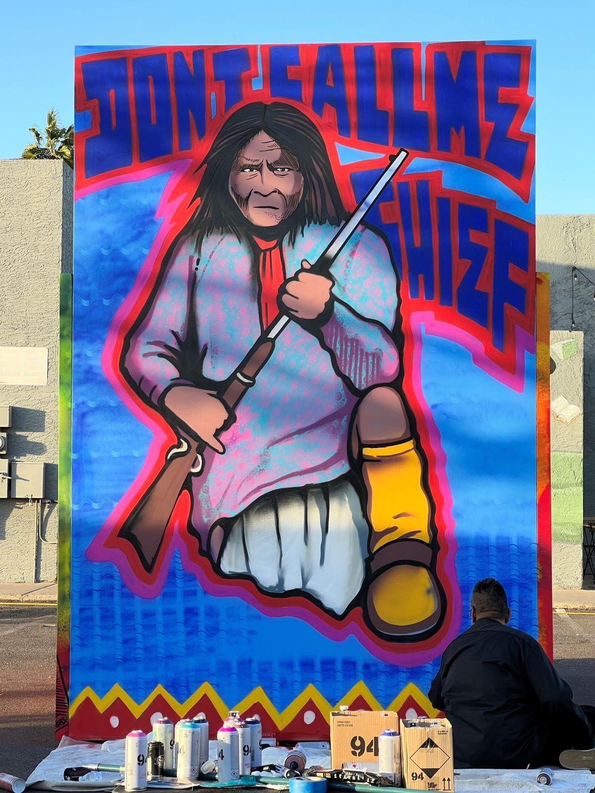 PHOENIX — As Super Bowl LVII was getting underway in Glendale, Arizona, on February 12, artist and Apache Skateboards founder Douglas Miles (San Carlos Apache, Akimel O’odham) was protesting racist mascots in the NFL by painting a mural-style portrait of Geronimo with the words “Don’t Call Me Chief” for a community event at Grassrootz, a Black- and worker-owned bookstore near downtown Phoenix. Meanwhile, protesters who’d gathered near State Farm Stadium marched while chanting “Change the name” and “Stop the chop,” both references to the Kansas City Chiefs, who would eventually go on to win the game as fans in the stadium used the chopping arm gesture that these activists find offensive.