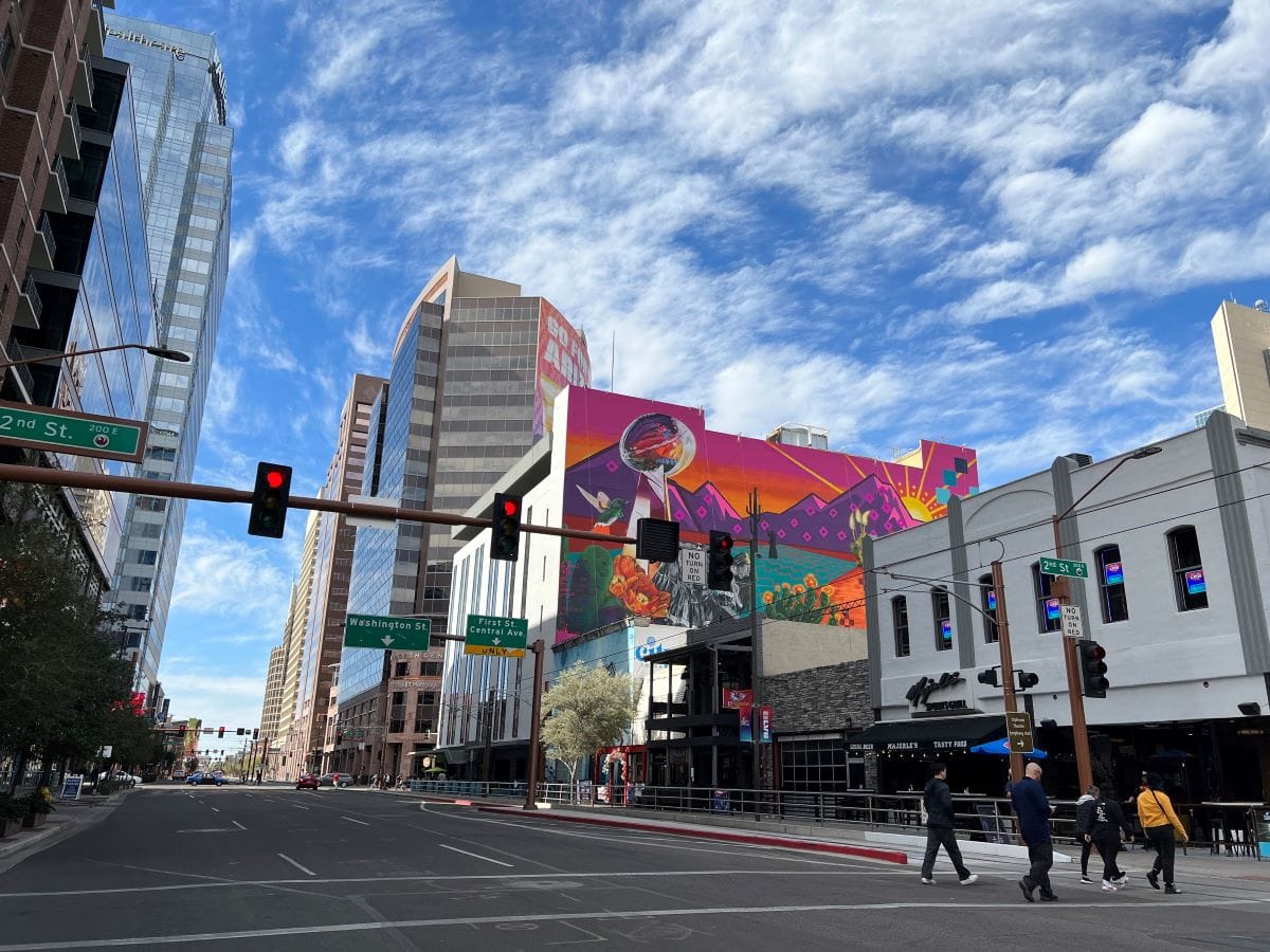 Even so, the most visible public-facing art wasn’t created as a protest. Instead, it was used to promote this year’s championship game. The NFL commissioned Phoenix-based Lucinda “La Morena” Hinojos (Apache, Yaqui, Akimel O’odham, Chicana) to create artwork that appeared on tickets and the souvenir program for Super Bowl LVII. She also painted a massive mural in downtown Phoenix, with the help of several Indigenous artists.