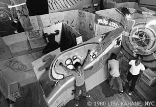 A good example of what Fashion Moda achieved can be seen in Jane Dickson‘s City Maze from 1980, which was a hugely popular exhibition and an important part of the city’s graffiti art history. City Maze consisted of discarded refrigerator boxes that Dickson and Stefan Eins picked up around the South Bronx neighborhood, with which Dickson then constructed a labyrinth-like maze decorated with a painted city skyline. Graffiti writers CRASH and NOC 167, who Dickson met through her husband Charlie Ahearn, spray-painted the maze with stars, swirls and other abstract graffiti designs, transforming the boxes into an approximation of the city.