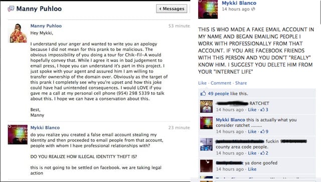 To my surprise, the next post was a screen capture of a message from the artist behind Mykki Blanco’s fake website; it was Manuel Palou (going by Manny Puhloo on Facebook — we are all a little constructed online), apologizing for any problems that arose from the project.