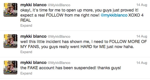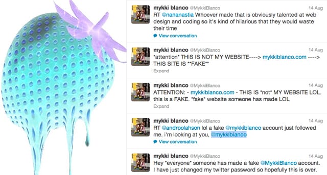Either way, this Mykki Blanco was unsurprisingly tweeting that the website I had seen earlier and the associated account was a fake. Some of Mykki Blanco’s fans were expressing how excited and then let down they felt after getting a fake follow from Mykki Blanco when the real account had failed to follow them. Subsequently, Mykki Blanco began following hundred of fans, and there was an outpouring of Tweets in reply, thankful for a real follow from the real Mykki. It was wonderful interaction to watch over Twitter.