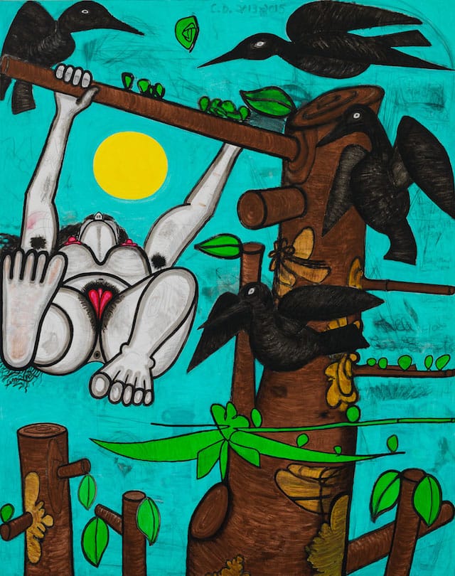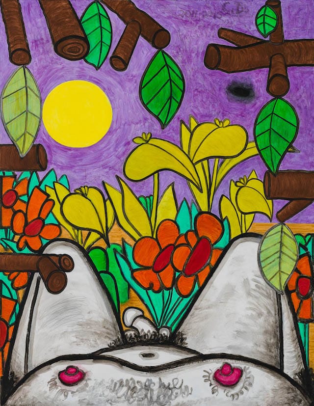 When I first saw all the works for this exhibition I assumed Dunham was leaving the tree-water-sky universe he’s been explicitly working with over the last decade in a series of paintings of enormous nude women, trees, flora and skies. He’s likely not, and instead introduced a new element via a trio of paintings called “Now and Around Here” (2011–15): a reclining male nude emanating from the bottom corners. To get to this or any completely new composition, Dunham will produce a blizzard of drawings. He calls drawing an “armature” on which he can hang the painting. He draws and draws again until he gets a given composition right, using a specific visual vocabulary. That vocabulary has been with him since the beginning of his work:
