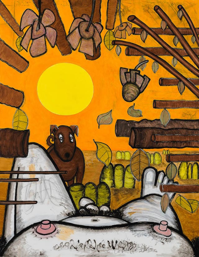 The most striking of these is the final canvas, “Now and Around Here (3)” (2015), with its dog looking out at the viewer. It’s a friendly dog, and harkens to the birds and the horse. Dunham notes, “I’m trying to find a way to get the whole human race in there along with its close friends. It just seems like the imperative. That’s where my imagination goes.” The scene itself, with its falling leaves and autumnal colors, is in some ways a companion to “Culture as a Verb,” but less frightening. Sorrowful, yes, but also hopeful. The reclining man has also seen bright skies of green and purple, but now things have changed, and perhaps the flip side to fear is renewal and companionship. Hard to say, really, but that one gets at Dunham’s contradictions and unabashed (though winking) grandeur.