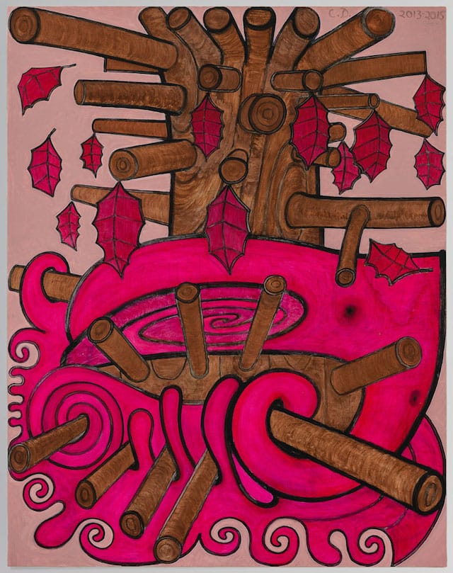 The odd one out in Carroll Dunham’s current exhibition of paintings at Barbara Gladstone is “Culture as a Verb” (2013–15). It’s the closest thing Dunham, or anyone in my recent memory, has come to painting the feeling of terrified, paranoid sorrow. The paint shows a section of a tree, its stumpy branches protruding outward to the edges of the canvas, auburn leaves dangling and falling; its bottom portion is ensnared by a red mass of spirals and curves; where still visible, the tree is distorted as if seen through a concave lens. The tightness of the protoplasm’s grasp, its every hook outlined in thick black, pulls the entire painting downward, practically through the floor. There’s nothing else like it in the show, or (constituent parts aside) like it in Dunham’s oeuvre. He calls this painting variously: “A totem.” “A sculpture I don’t know how to make.” “An upside down tree that’s been really screwed up.” “A vibe or an aura that can’t be described easily.” “A hunk of wood and some protoplasm.” In other words, the painting is meant to be complex. I of course want him to cop to making a painting about spiritual fear, and his own experience of same, but he won’t give it up for me, which is okay because he won’t give it up for himself either. In conversation Dunham both enlightens and obfuscates. He is deeply articulate about what his paintings are and are not in all their past and present physicality but refuses any easy readings (narrative, biographical) of the actual things depicted between the stretcher bars: