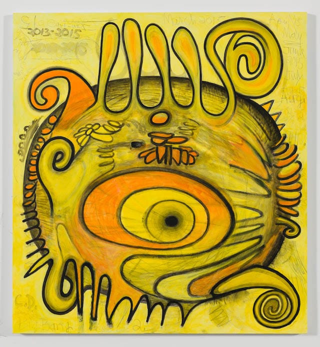 The odd one out in Carroll Dunham’s current exhibition of paintings at Barbara Gladstone is “Culture as a Verb” (2013-2015). It’s the closest thing Dunham, or anyone in my recent memory, has come to painting the feeling of terrified, paranoid sorrow.