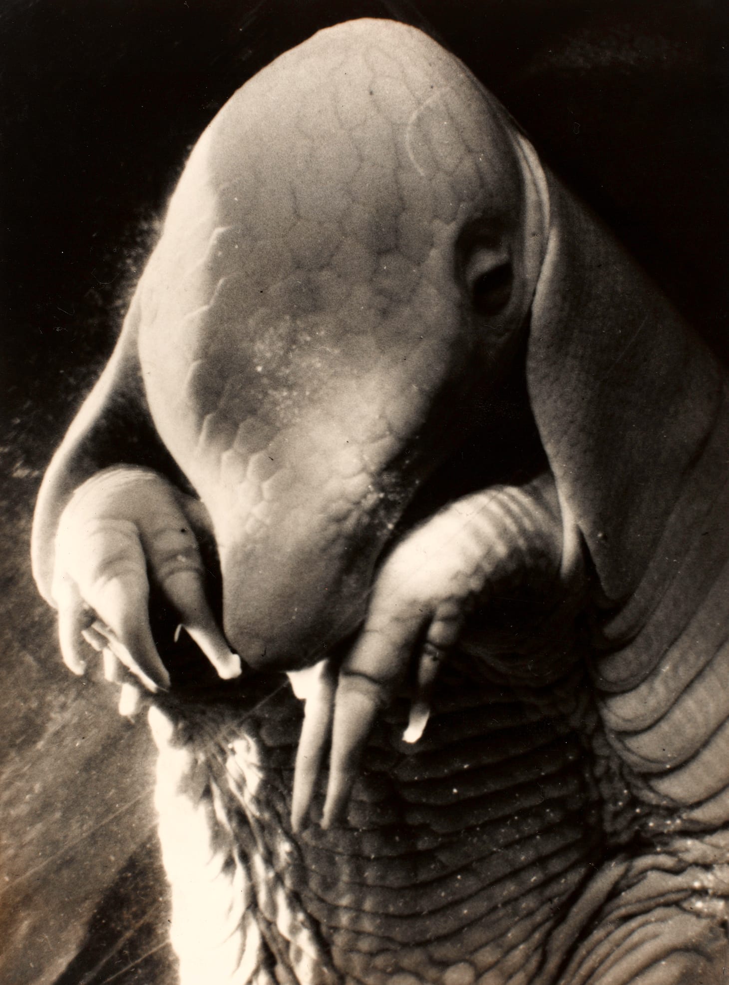 For her seductive surrealist art, Maar experimented with her commercial photographic techniques, producing haunting and enigmatic images like the harsh-haloed “Portrait of Picasso, Paris, Studio, 29, rue d’Astorg” (Winter 1935–36), the spry “The Pretender” (1936), and the utterly mad and wholly hilarious hand-colored gelatin-silver print “29, rue d’Astorg” (circa 1936). Her paramount surreal art piece was the sensationally bizarre picture of an armadillo fetus, “Portrait of Ubu” (1936). These and more of Maar’s often psychologically loaded photographs appeared in various Surrealist art exhibitions, like the famous 1936 L’Exposition d’objets surréalistes at the Paris Galerie Charles Ratton.