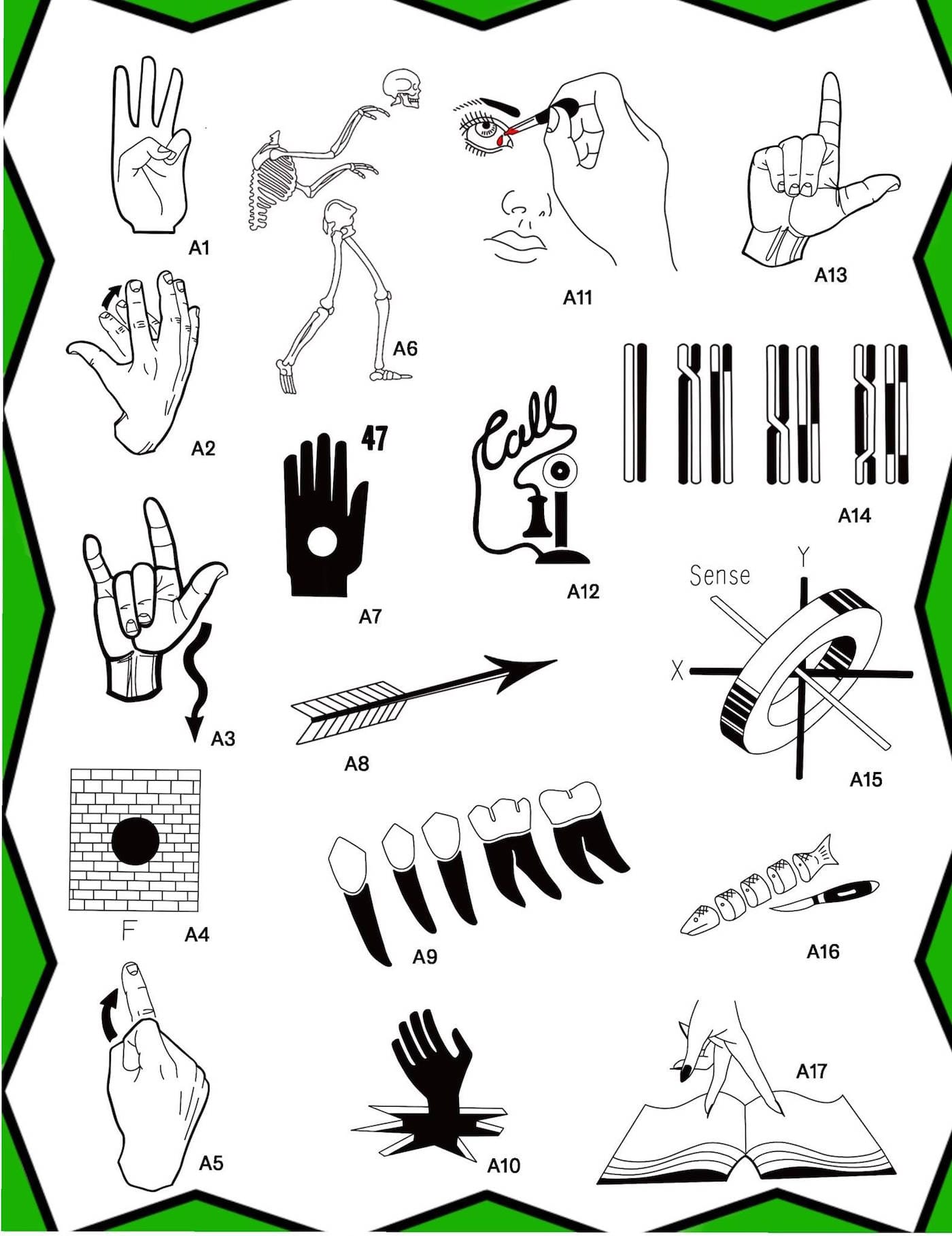 Garner, who has been giving tattoos for two years now, mined Pioneer Works’s Reanimation Library — a collection of “near-obsolete publications” — and found “some really random imagery” as inspiration for her designs. The library keeps a wide array of books; recently acquired titles include Blasters’ Handbook: A Manual Describing Explosives and Practical Methods of Use and The Freeway in the City. Garner told Hyperallergic that she tried to “form some common themes” for her flash sheet, including “hand signals, parts of the body, body systems, and the occasional escalator going up into a vagina.”