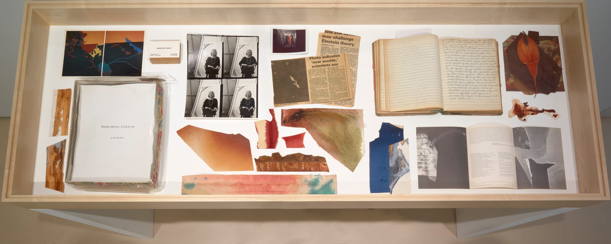 Perhaps the most compelling aspect of Illuminated Earth is how the exhibition uses archival ephemera, like journals, newspaper clippings, and scraps of old paintings to let Hood speak to us for herself. Ephemeral bits of her everyday life from the archive of her papers at the Art Museum of South Texas show audiences why they should appreciate Hood’s work. This material elucidates how and why she went about the everyday business of creating her art, allowing it to be illuminated by the artist herself. It helps her to shape her own legacy, through her own words, to shine her own light on her work.