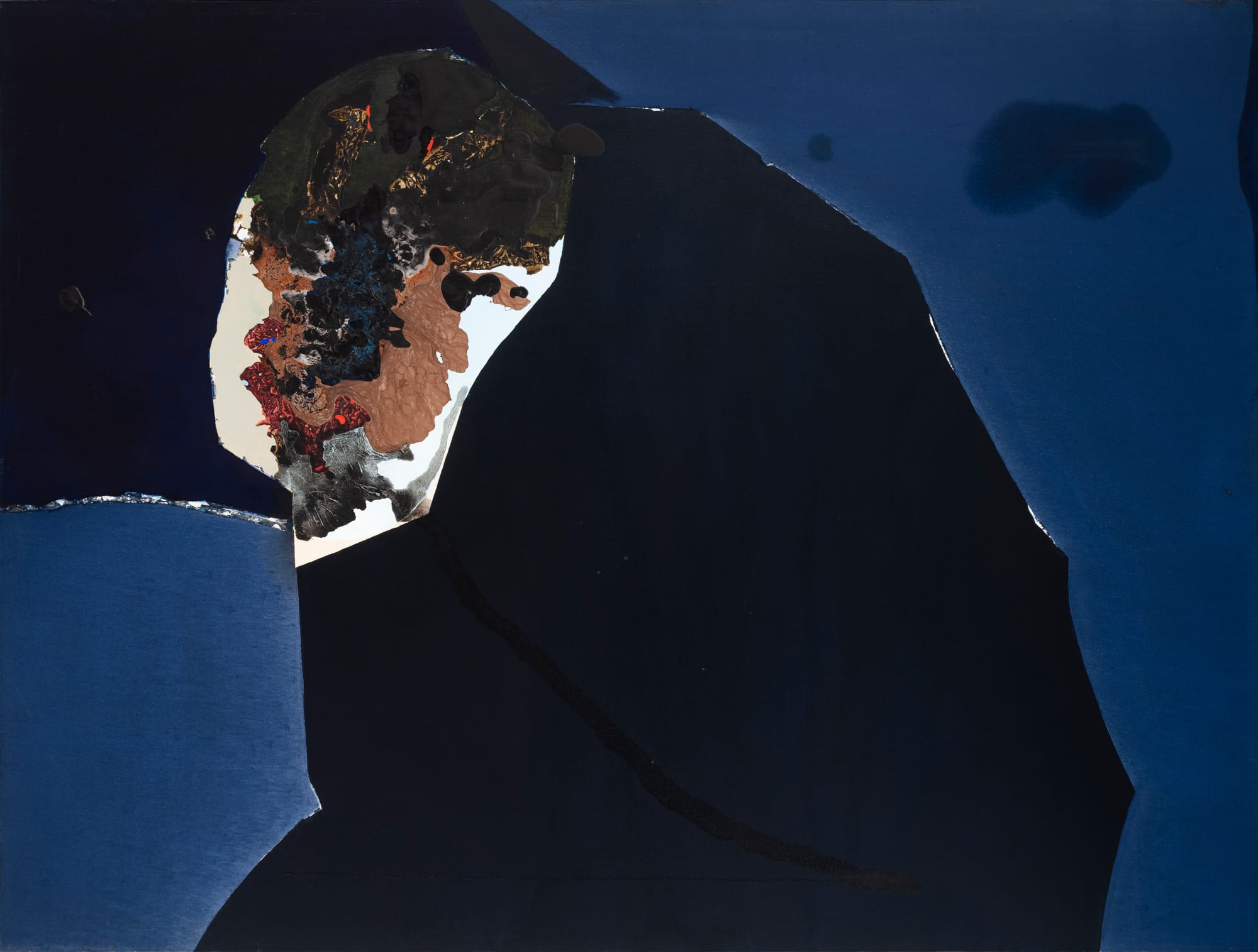Illuminated Earth features 16 of Hood’s paintings, ranging from abstract collages (“The Money for School,” undated) to the enormous and powerful “Illuminated Earth,” from which the exhibition draws its name. Most of the pieces on display date from the 1970s and ’80s and all are excellent examples of the tension in Hood’s work between hope and despair, darkness and light. In particular, these pieces work with landscapes — landscapes that are informed by the size, scale, and vastness of her native Texas. It is difficult to look at Hood’s “Minoan Blue,” (1973) for example, and not see a backstop of endless, blue, blue Texas skies.