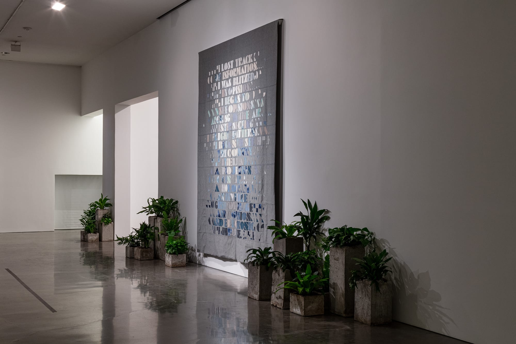 The film, and the exhibition that features it at Regen Projects, also titled Flags and Debris, were conceived in response to the COVID-19 pandemic. (All works except the film are from 2020.) The dancer’s covering is one of the “flags,” a large wall hanging adorned with text, which Aitken made from fabrics he found in his Los Angeles home while the city was on lockdown last spring. Seven tapestries, collaged of multicolored textile fragments, hang in the gallery’s main room (another one is opposite the front desk, flanked by plants).