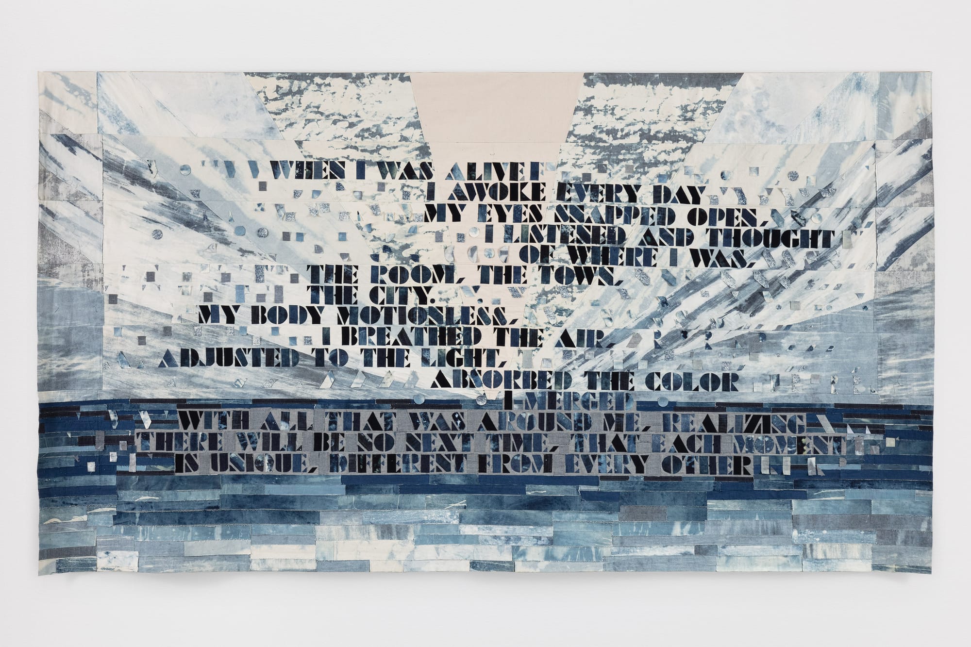 The artist’s tendency toward physical and spiritual lightness is particularly eloquent in the exhibition’s largest tapestry, “When I Was Alive.” An abstracted horizon collaged from blue and white strips of fabric is overlaid with a quote from Adolfo Bioy Casares’s 1940 novel The Invention of Morel (La invención de Morel):