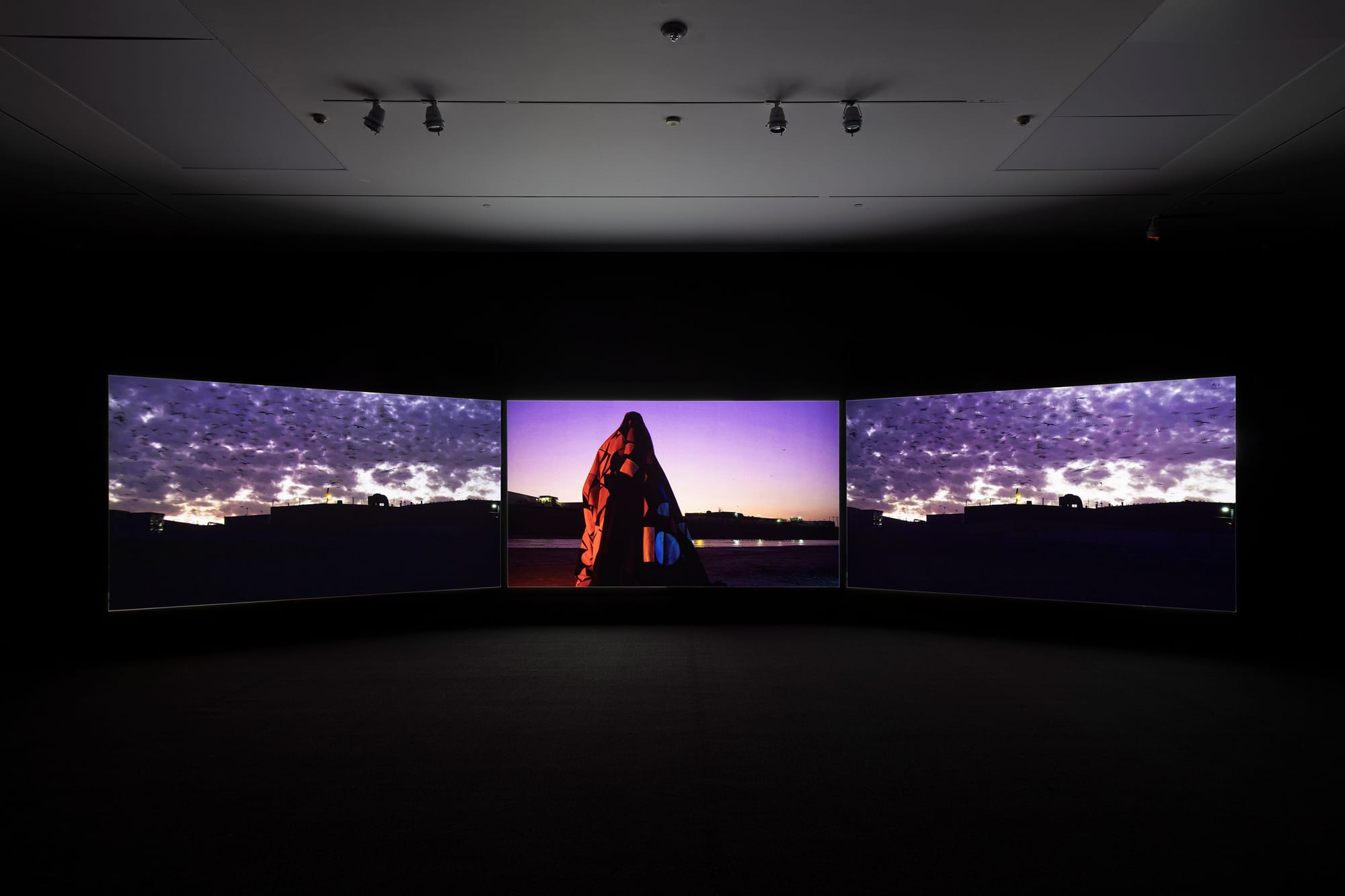 The film took shape when Aitken envisioned the tapestries as shelter or protection that could be activated by the human body. Across the three large screens, the artist alternates between broad aerial views of the city and close-up views, such as storefronts, empty parking lots, or parts of the Los Angeles River. The dramatic dance performances, created in collaboration with the group LA Dance Project, are accompanied by a score that is, by turns, foreboding and airy.