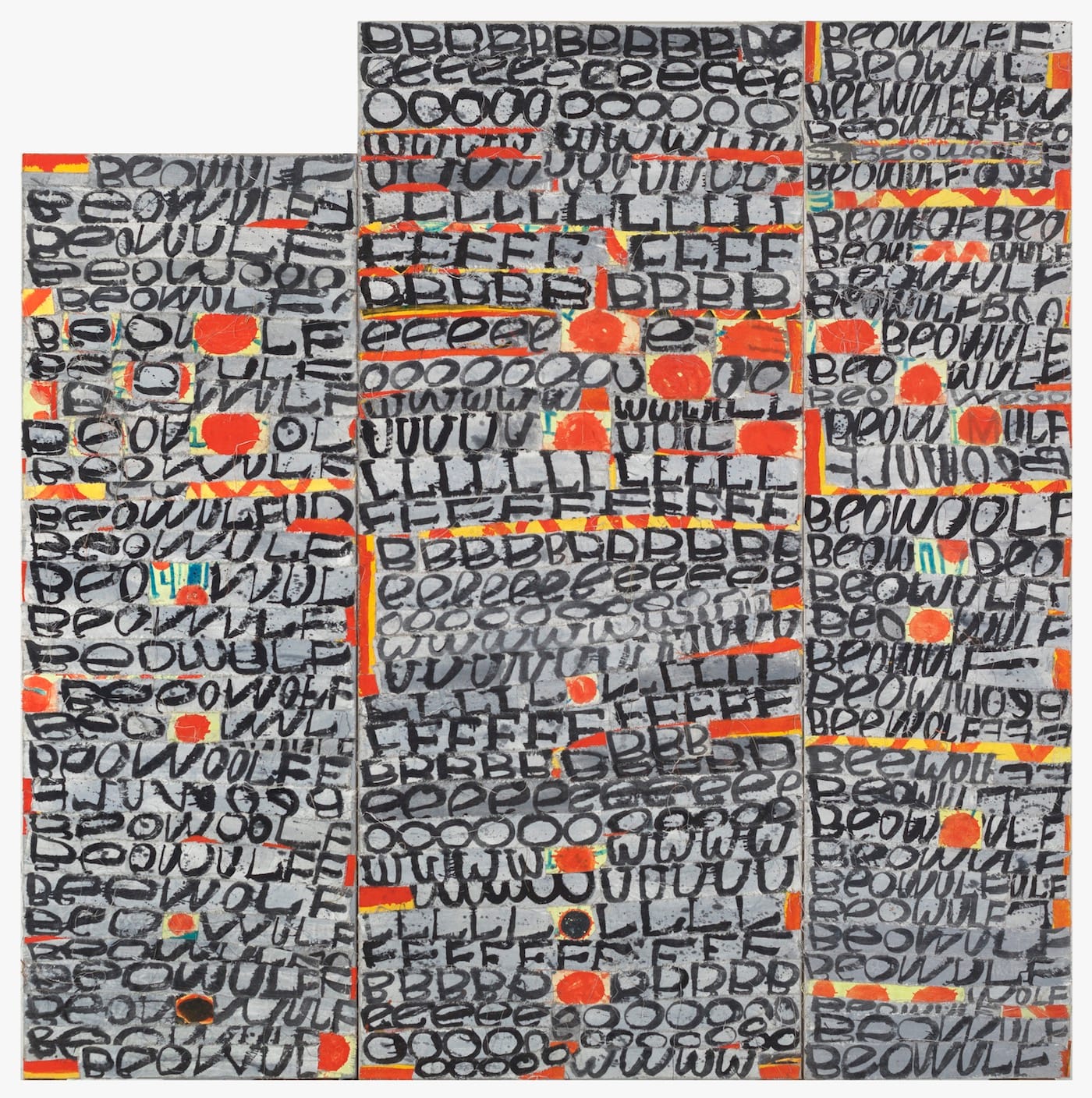 Florian’s repetition of the letters of “Beowulf” recalls the Old English epic poem’s use of alliteration to generate its rhythmic pull, but it also becomes an insistent series of puerile sounds. Might we not also hear ”bay of wolves” in Florian’s repetition, as in an architectural recess, a body of water, or a prolonged howl? Done on three separate canvases, one of which is noticeably shorter than the others, that have been abutted together, the grouping underscores the perception that Florian’s process consists of joining similar things to each other— letters, painted strips, and stretched canvases. The process mirrors the content, infusing the work with a manic insistence that is funny and disturbing. We are apt to find the persistence unsettling because it hints at depths of rage being held in check.
