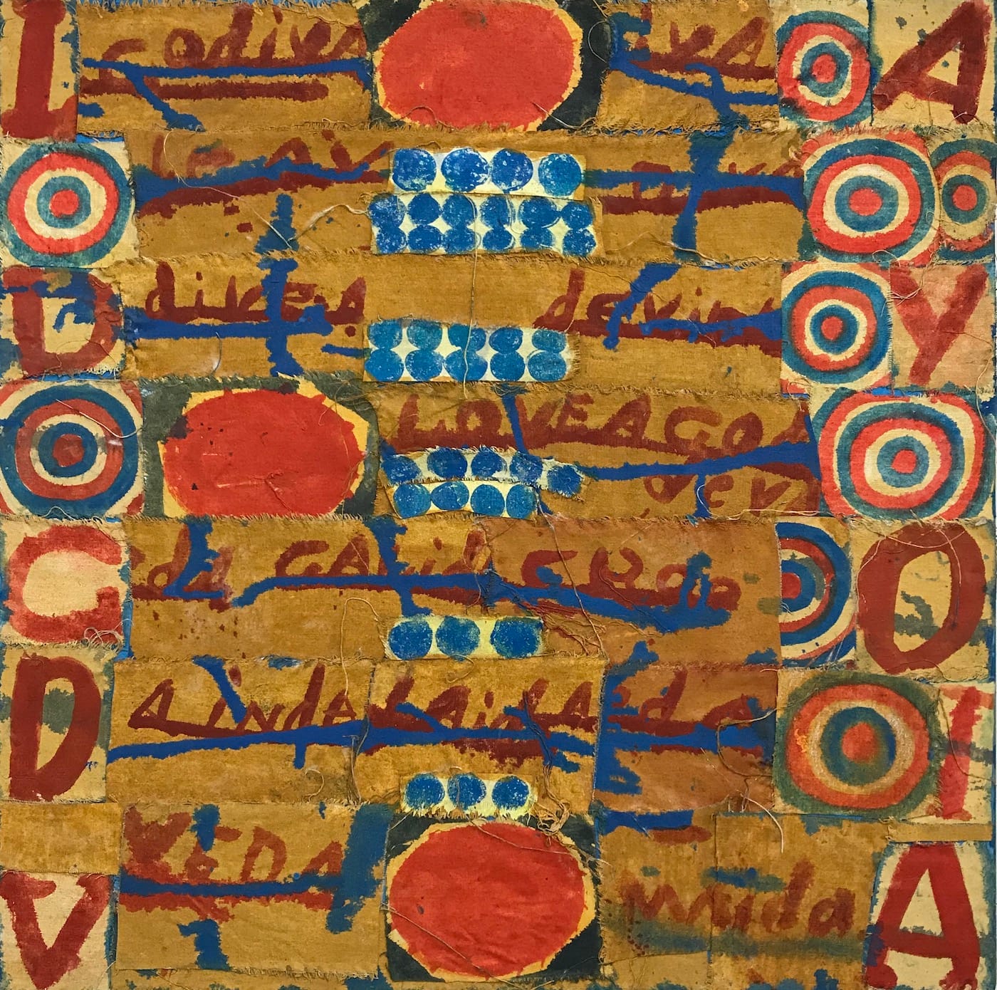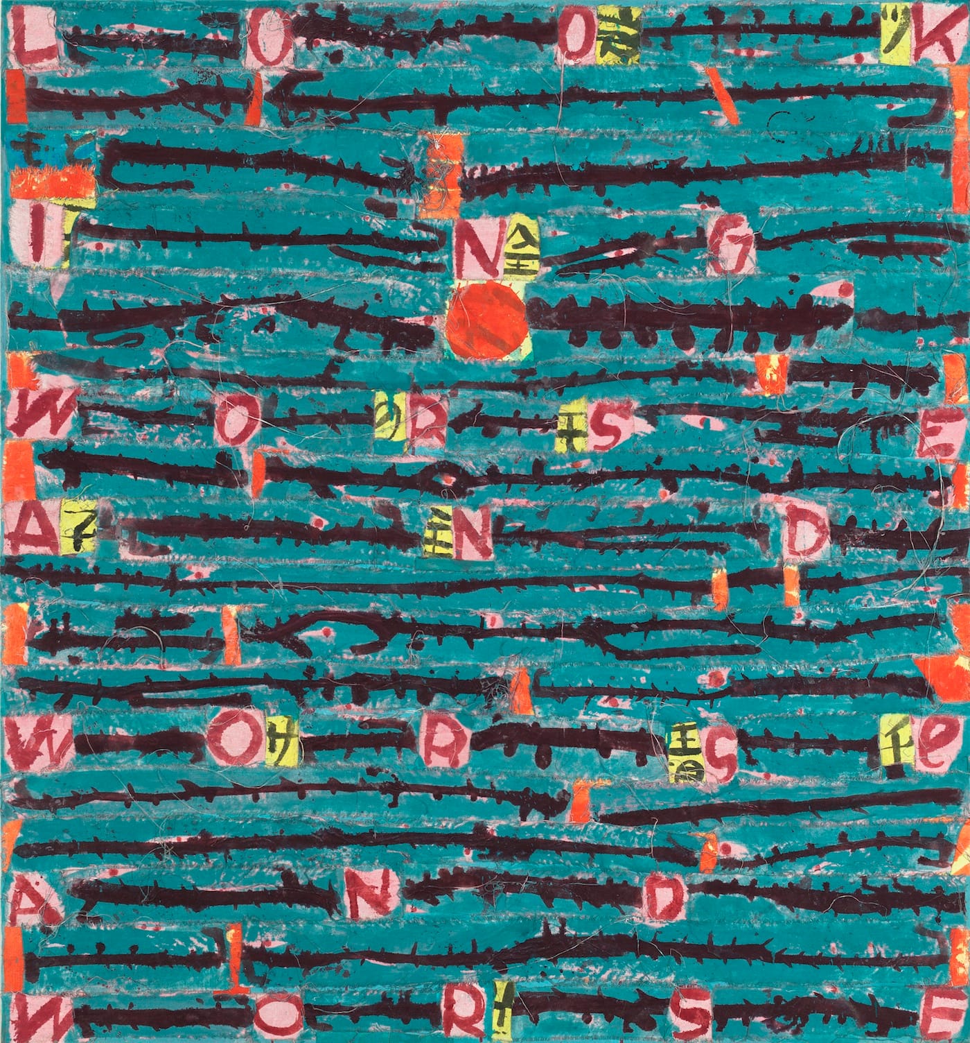 These paintings are a way to reflect upon the scars that language has left on your body. They are funny in a creepy way — the result of a man writing the same words over and over again, turning the letters into abstract patterns echoed by circles and concentric circles, as if this might either neutralize them or instill them with an incantatory power.