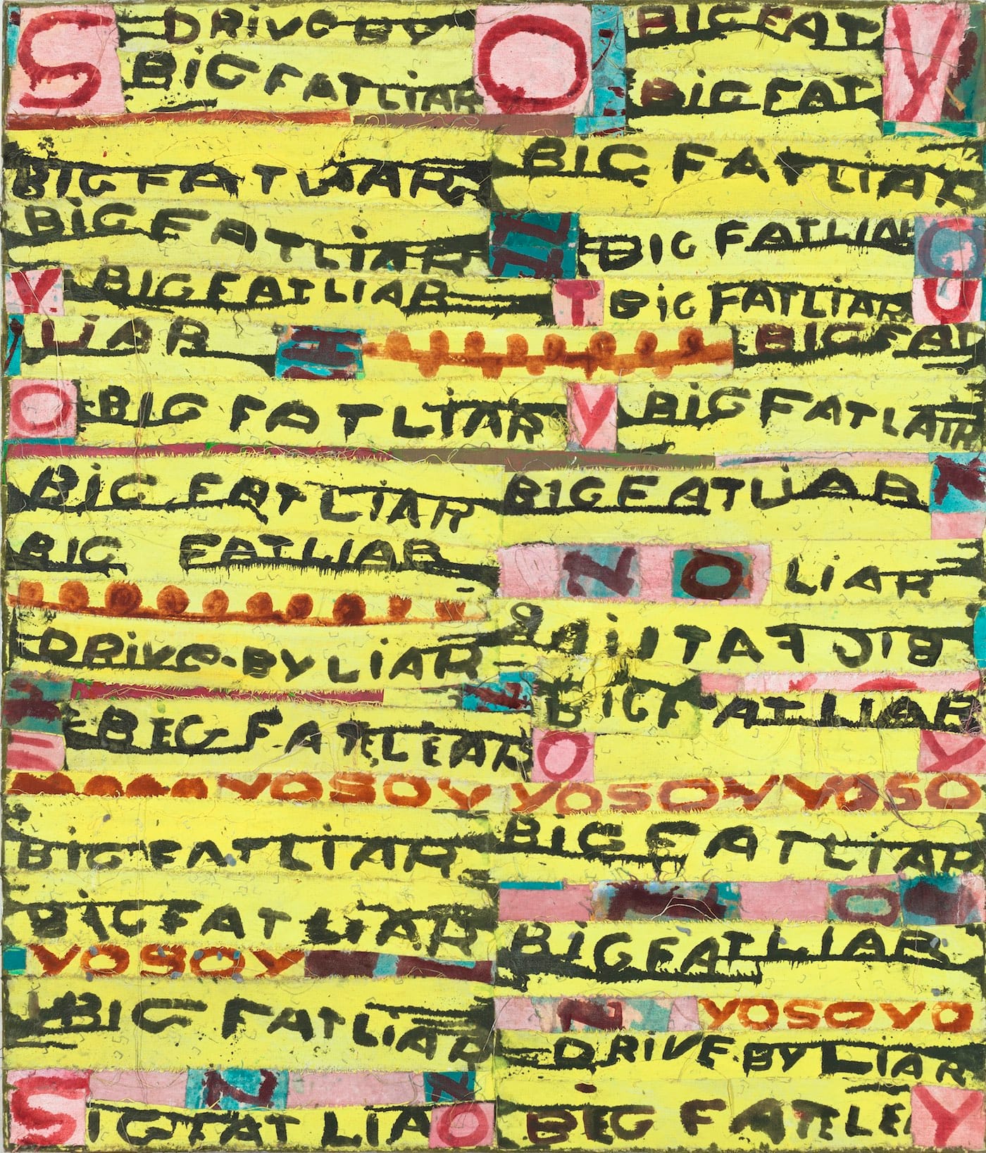 The strips, with their frayed edges and loose threads, evoke a body politic in which such phrases are routinely thrown about, seemingly as a form of entertainment. At times, you can look at the painting as a patchwork of abstract doodles, but what is actually written begins singing in your head — an insane bird or, worse, a human with power over others.