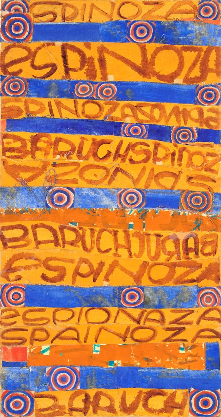 In “Little Espinoza” (2016), Florian alternates blue and orange strips from the top of the painting to the bottom. On the orange strips (sometimes one and sometimes two stacked together), Florian writes the following words in reddish-orange paint: Baruch, Spinoza, Espinoza, Espionaza, Spainoza. Sometimes he writes the letters upside-down or as a mirror image.