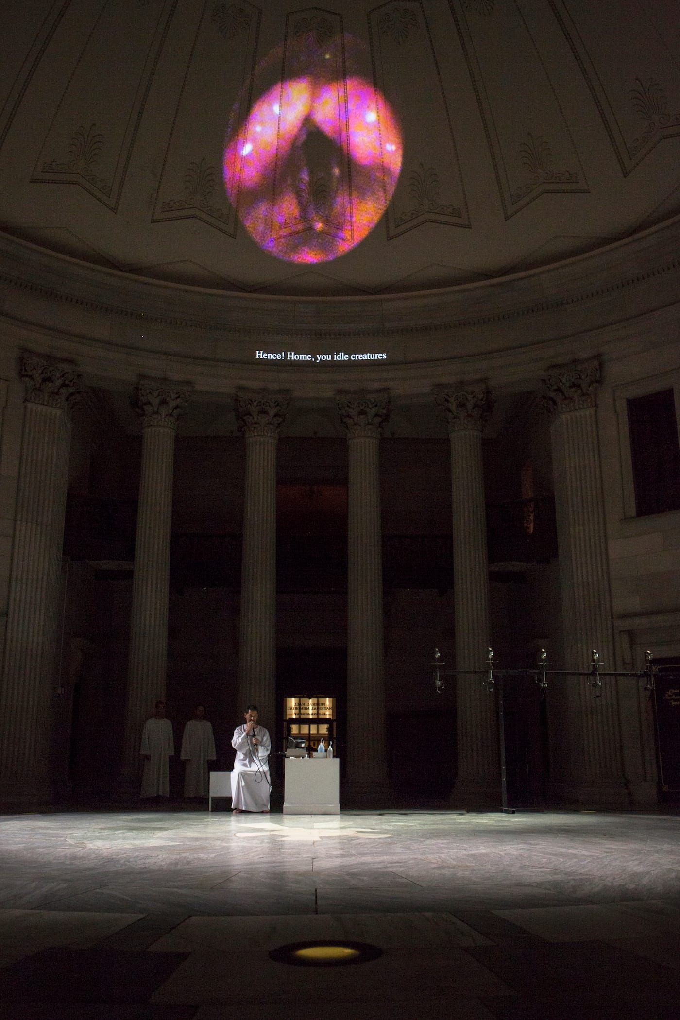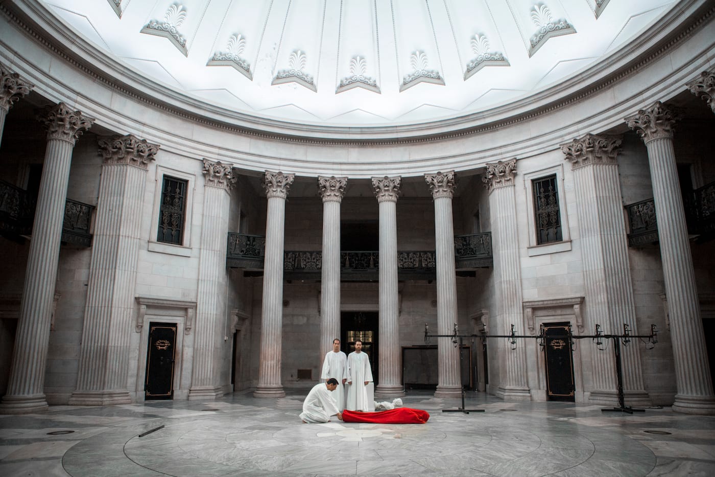 Castellucci has presented this performance in various iterations since 1997. Why here? Why now? A great deal of American history occurred at this site, including the oath of office of George Washington as the first president and the first meetings of Congress under both the Articles of Confederacy in the 1780s and the U.S. Constitution in the 1790s. (The historic building was demolished and replaced with the current structure in the 1840s.)