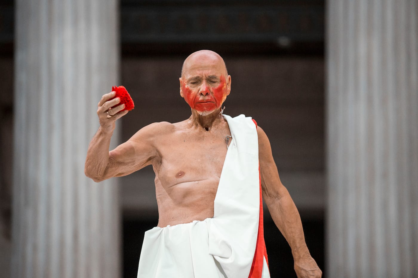 The third scene was Antony’s famous funeral oration from Act III, Shakespeare’s masterpiece of rhetoric, which Castellucci lightly edited. His old Antony wore two sashes, one white, one red, over his hunched and deeply scarred, bare torso. Antony is pure but has offered his hand to the bloody assassins. Castellucci’s Antony, Dalmazio Masini, had his vocal cords surgically removed for medical reasons. Castellucci taped his body mike on the outside of his throat; the language was turned into a muffled, indistinguishable stream.