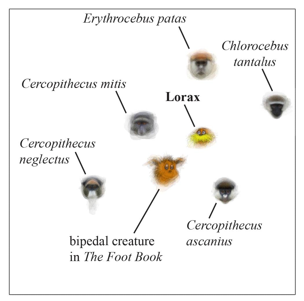 ND: Well, from our perspective it was the most conservative choice because of all the creatures in Seuss’s world, that one arguably is the one that’s most like a monkey and most like the Lorax. And so we thought, “okay, you know, if some cranky critic says ‘well maybe the Lorax is just an exemplar of many types of bipedal orange creatures in Seuss’s world; then it’s just merely a coincidence that it looks like a patas monkey.’” So that’s why we felt like it was important to take the Foot Book creature and put it into the same analysis to show that the Lorax looks much more like a patas than even this other creature, which looks an awful lot like a primate.