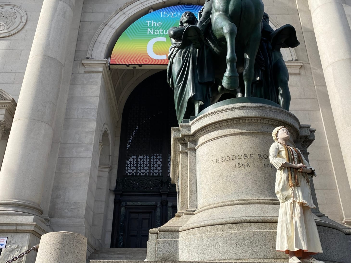 A group of about 30 spectators and journalists trail behind her as she walks downtown on Central Park West toward the American Museum of Natural History, the second stop on the route. She pauses in front of a towering statue of Theodore Roosevelt flanked by an African figure and a Native figure. After years of activism by Indigenous and grassroots groups and added pressure from the Black Lives Matter movement, the city agreed to take down the monument this past June; on Election Day, however, it still stands, an enduring symbol of the nation’s unshakable past. Dragonfly looks up at him, then turns her back in defiance: one monument challenging the presence of another.