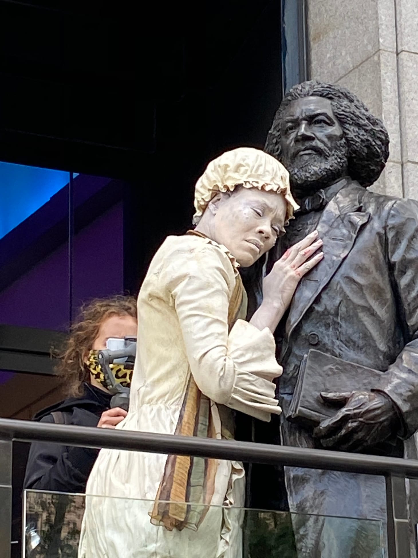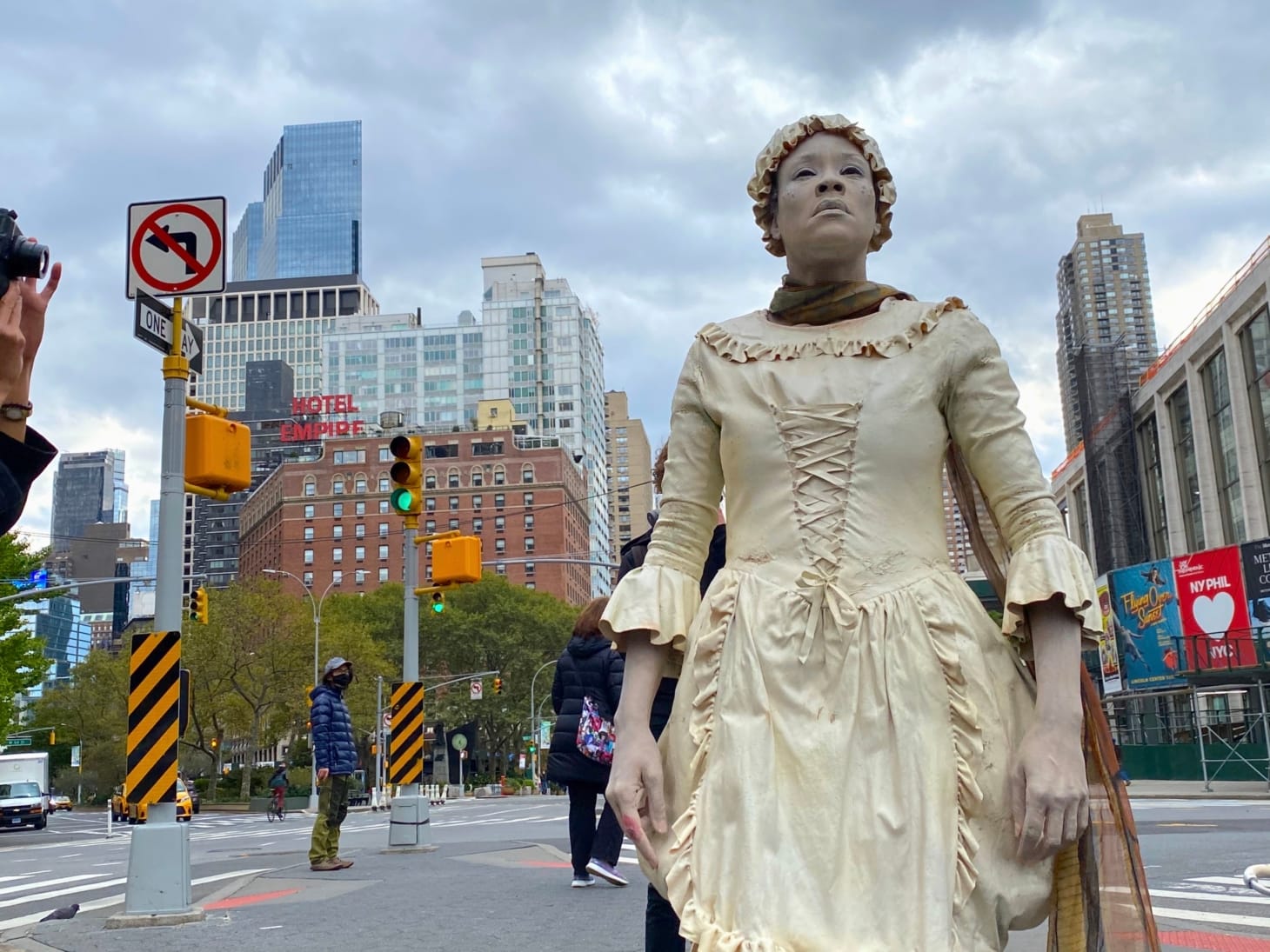 Artist Robin Laverne Wilson, known as Dragonfly, conceived of her performance “Absconded” to honor Judge’s legacy by creating a living monument. Dressed in the garb of Judge, Dragonfly walked the streets of upper Manhattan, activating and engaging with historical landmarks and elements of the urban landscape that signal America’s history of chattel slavery and its insistent echoes in the present.