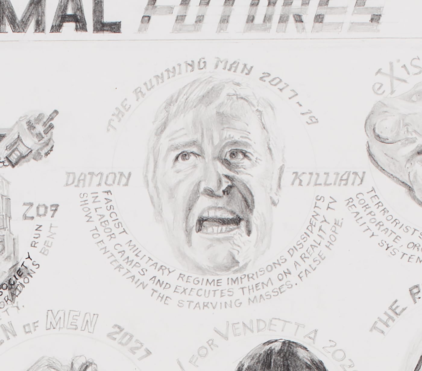 Today, Hyperallergic Weekend begins its new feature, DRAWING IN A TIME OF FEAR & LIES, with “Various Dismal Futures” (2016), a work in graphite on paper by William Powhida.