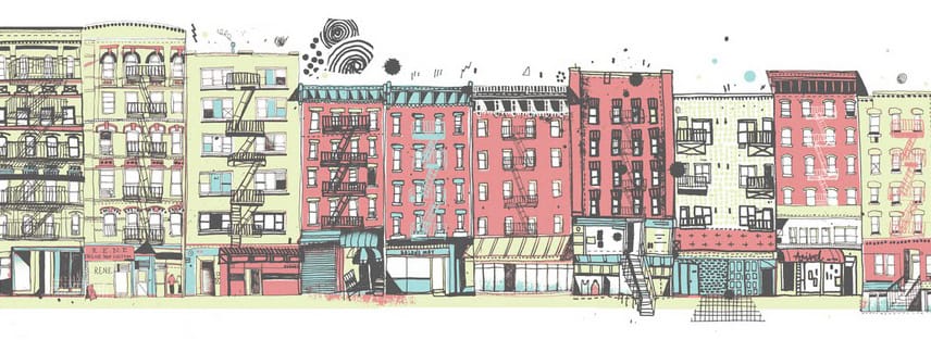 Through All the Buildings in New York, Hancock also takes wide detours through our home borough of Brooklyn and manages to catch a few buildings that we’re very familiar with– check out the artist’s version of Hyperallergic favorite Fives Leaves restaurant in Greenpoint. Hancock takes care to document the rough spots as well as the architectural high points of our surroundings, observing the poetry of silhouetted fire escapes as easily as the wall supports of a collapsing structure on Broadway and Reade.