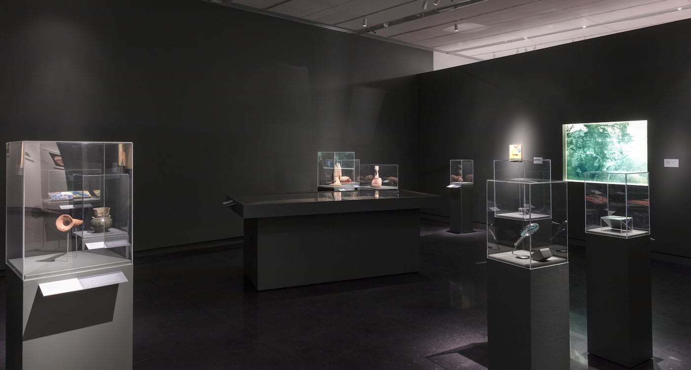 The “egg MUSEUM” (2018) installation contains objects donated to the museum collection, but largely stripped of their provenance. A glazed pot, Persian tiles, a shard of colored glass all claim a pedestal. Three Buddhist illustrations on view were accessioned with evidence that they were payment to an American doctor, who was based in Cambodia before WWII. On his sea voyage home, he died, and the unopened crate that contained the artwork was sold by San Francisco customs authorities. Nearby, a monumental Chinese ancestor painting with 42 figures remains incomplete, the text boxes missing names. The people that anchored a family for generations are now anonymous.