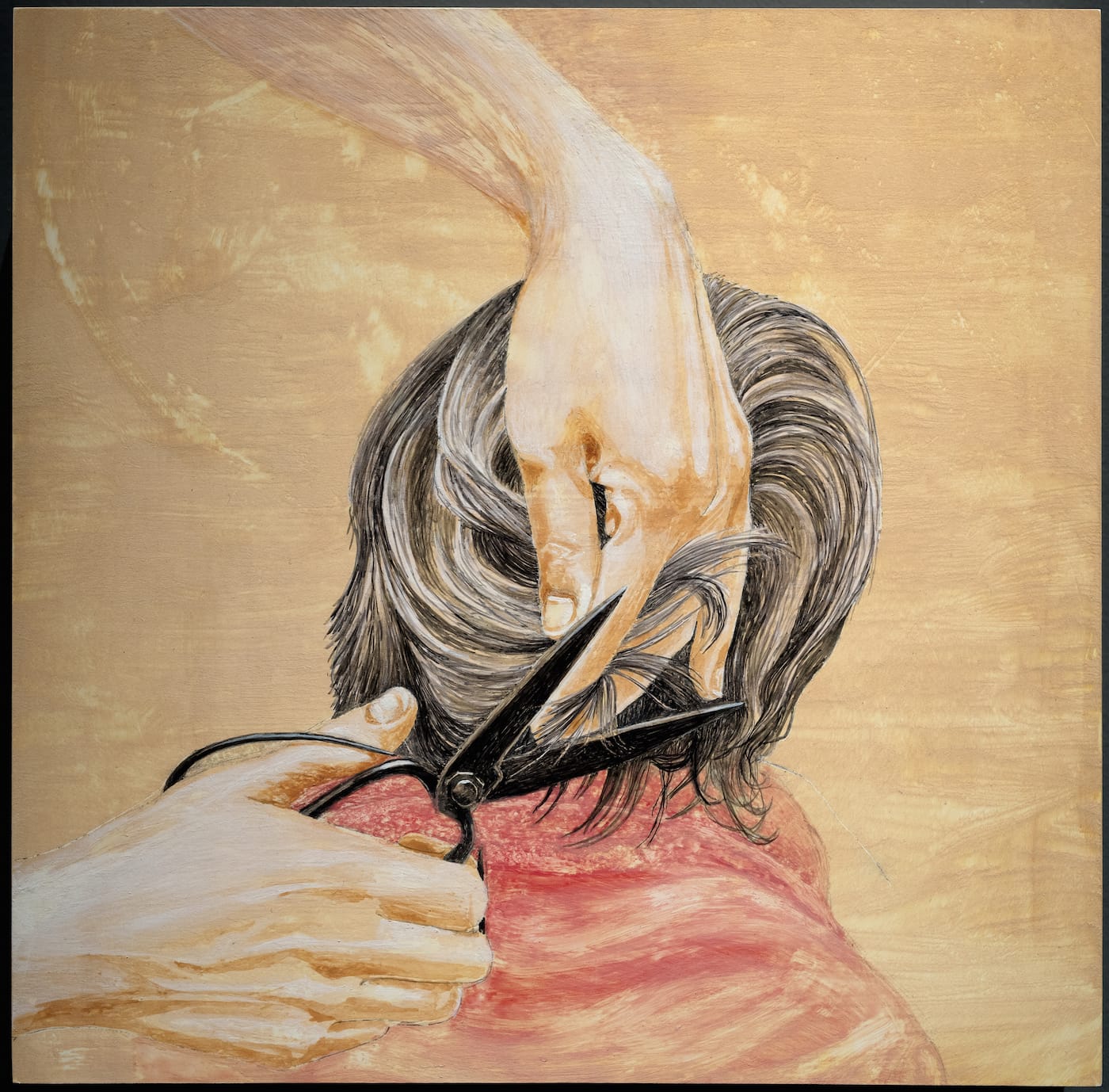Consulting university resources, Chen included objects she believed were associated with the Silk Road. Their lack of context could be problematic, but they take on new meaning alongside artifacts from the personal journey of her family matriarchy. The found photo of her 8-year-old mother and grandmother is enlarged and backlight, like a beacon to the castaways in the “egg MUSEUM.” As a final intervention, Chen encircles the gallery with tempera paintings of details from the photo, such as her grandmother’s fingers tucking her mother’s hair behind an ear. She renders two tangled sets of legs with such a gentle touch she recalls the affection with which Arshile Gorky painted his mother. The series also includes moments not in the found photo, such as Millie Chen cutting her mother’s hair. Her fragile nesting of generational stories into one image makes for a hopeful mediation.
