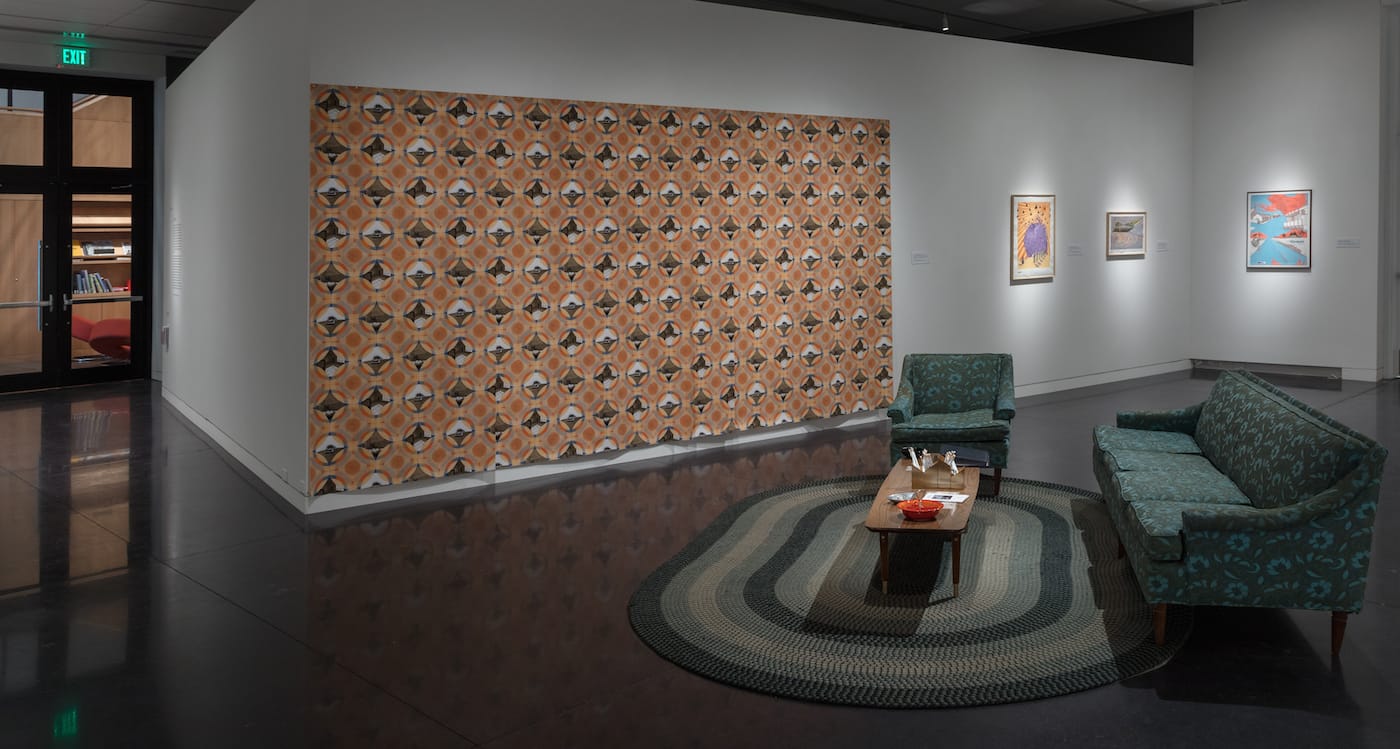 In her new show at the University of Colorado-Boulder Art Museum, the artist Millie Chen explores alienation and memory by borrowing from historic images of violence: the site of a coup, a sky full of military choppers, a university where students were shot to death. Millie Chen: Four Recollections includes “Prototype” drawings that double as wallpaper mock-ups, with color scales in the margins for prospective production, and one example fully realized on a gallery wall. When I spoke with her, she declared, rather mysteriously: “The wallpaper is insidious.” Chen has made a drawing for every year of the 1970s, most decorated with patterns inspired by Op-art (also called optical art) and embedded with recognizable scenes of violence.