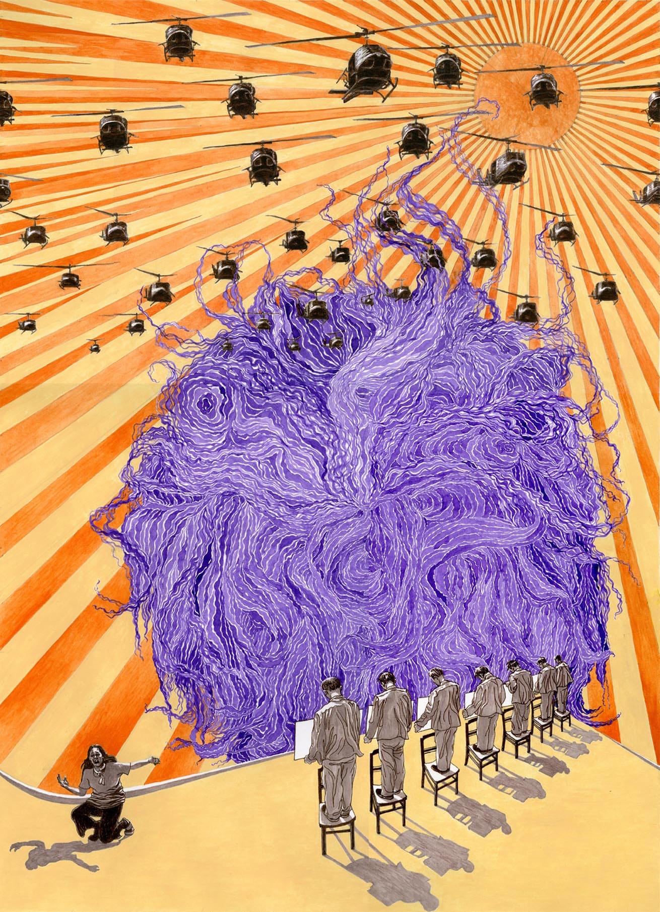 In “Prototype 1970” (2016), an orange sun sits high in the yellow sky, and its flat rays widen as they travel from their source — a familiar graphic not only in rock band posters of the decade, but also in Communist propaganda. (Only Mao’s smiling face, or a hammer and sickle, seem to be missing to complete the reference.) A swarm of helicopters flies toward a depiction of Mary Ann Vecchio, a witness to the Kent State shooting, who kneels in the foreground. In the famous picture from May 1970, Vecchio knelt in front of the dead body of a student, but here only her shadow is visible. Nearby are 7 men at a public shaming from China’s Cultural Revolution; rising in the center is a wild mass of Jimi Hendrix’s hair, threatening to eclipse the sun.