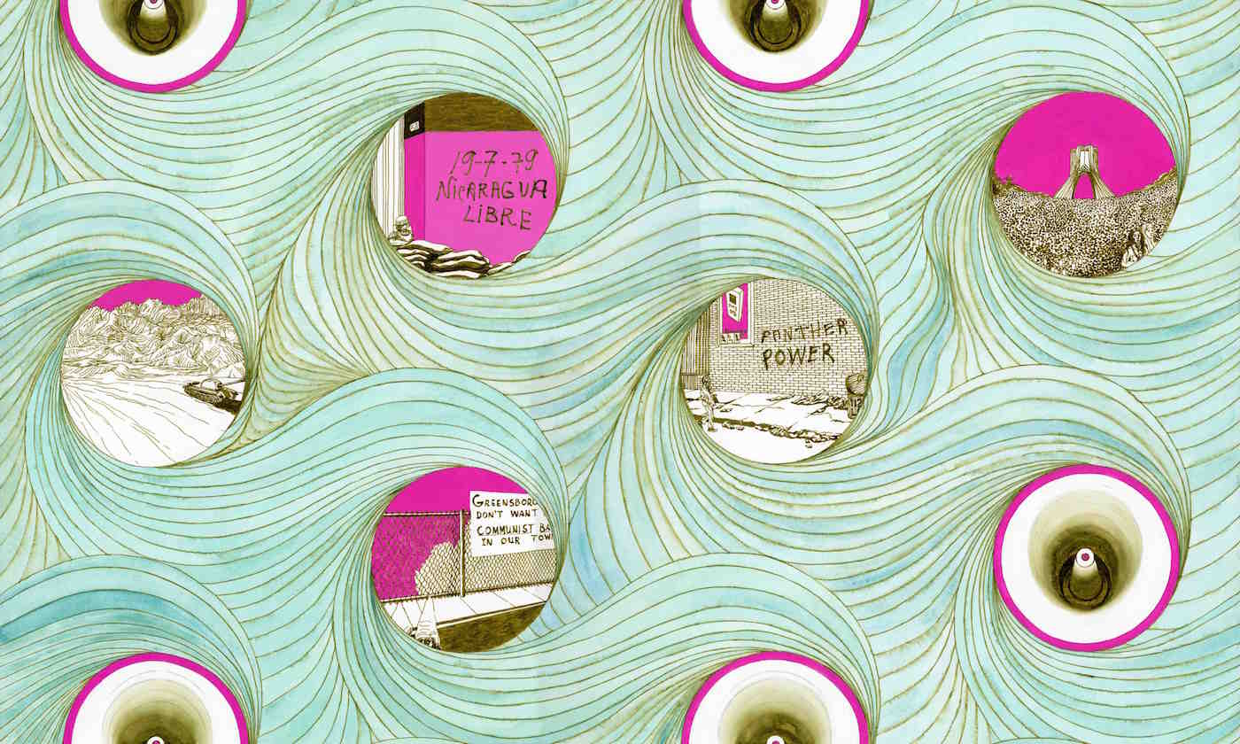 By combining the visual approach of wallpaper with iconic images of human suffering, Chen seems to illustrate a warning by the theorist Guy Debord: that spectatorship can dehumanize the people being watched. In The Society of Spectacle, Debord argues that spectacle — “the sun which never sets over the empire of modern passivity” — can be expressed through propaganda, entertainment, or iconography. Spectacle avoids supplementing a real lived experience, instead becoming an abstraction, or as he harshly calls it “added decoration.” Once images are isolated and accumulate copies, he says, they separate rather than unify society. Fittingly, in the last drawing in the series, “Prototype: 1979” (2016), people are almost entirely absent from scenes of Shahyad Square in Tehran and The Greensboro Massacre in North Carolina.