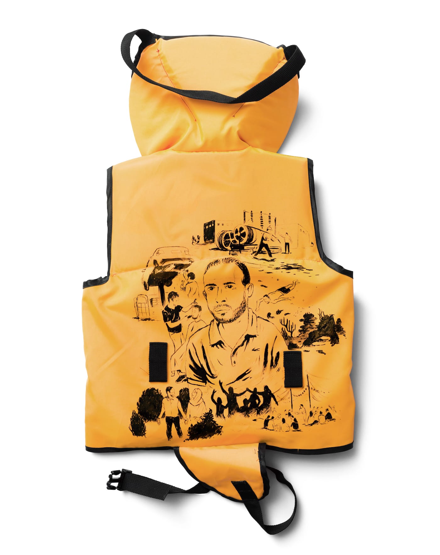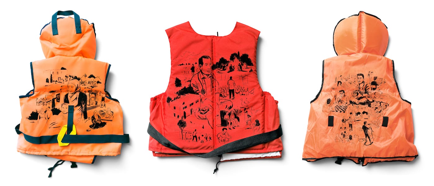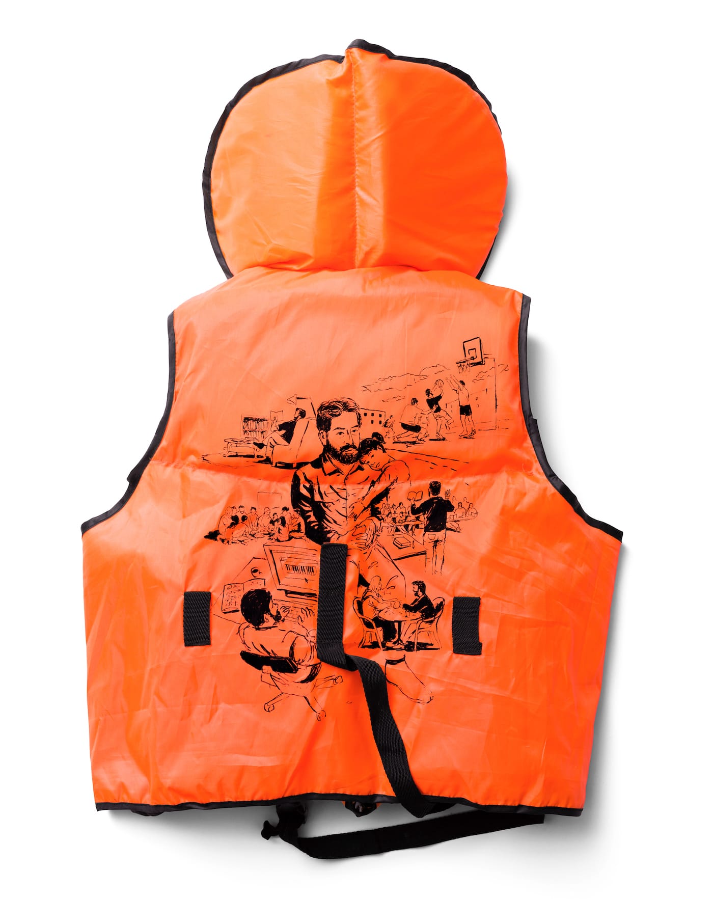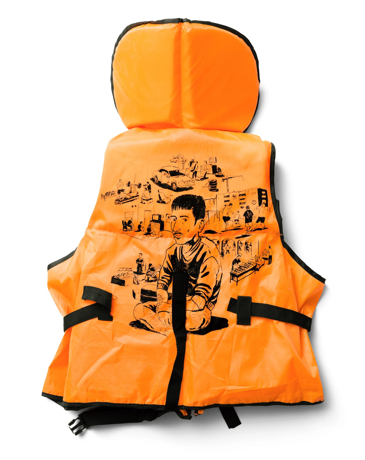 Swiss artist Matthias Leutwyler drew the memories, and the results are all online, accompanied by a recording and video of each interview session. You can listen to Ghalia, who’s originally from Aleppo and whose orange vest shows her dancing with her husband on their wedding day and pouring tea for her children (she has nine, now all grown). Or hear from Abdel, the 21-year-old from Homs, where he was the captain of his soccer team; his jacket shows him kicking a ball on the field, but also playing chess, taking photographs, and reading a book — simply enjoying hobbies that any young adult should be able to. The vests were previously displayed in Zurich; Project Life Jacket is now planning to organize a touring exhibition.