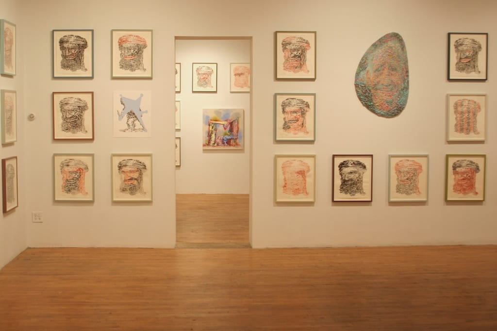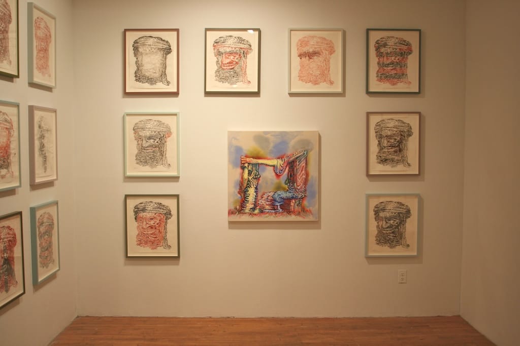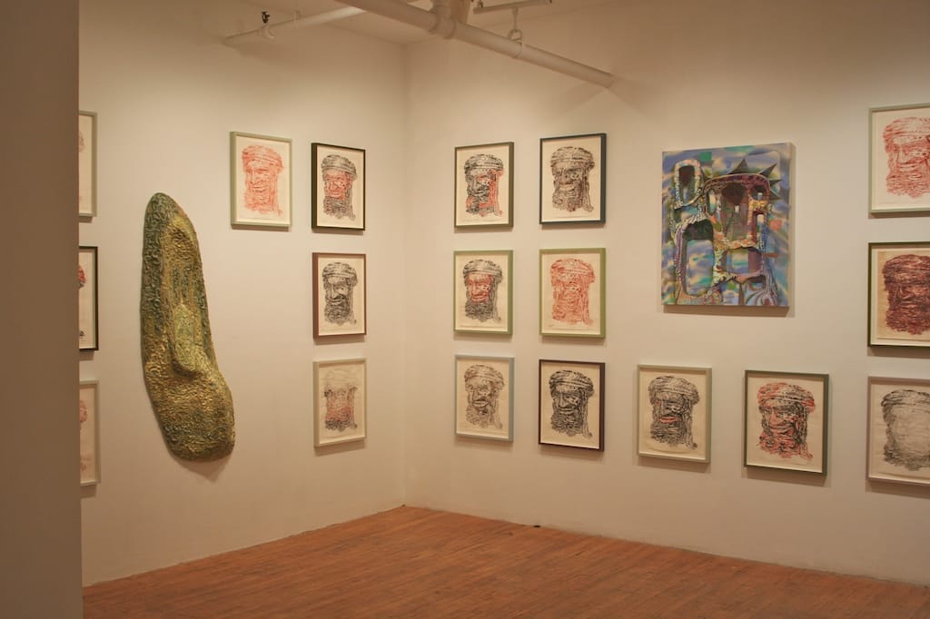 James Esber’s other work dots the grids of Osama paintings, wall-hanging sculptures that look like mounded up rounds of sculpy clay that form into lumpy faces and cartoonily surreal works on canvas and paper. Though it is Esber’s original drawing provided the impetus for the Osama portraits, I much prefer that work as a conceptual whole to the artist’s other 2D works. The sculptures are pretty cool, meant to react to changing light conditions and gradually reveal the faces of “figures who have accidentally stumbled into the media spotlight.” What makes them cool are their ambivalence to figuration. Much like the symbolic content of the Osama portraits, the face is only there if you seek it out. What is immediately visible is a playful pleasure in material and process.