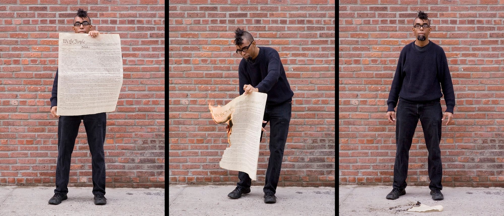 His subversive art expands from photography and flags to performance and printmaking. There's “A Man Was Lynched By Police Yesterday” (2015), which features a flag similar to the one the NAACP flew over their national headquarters in New York the day after someone was lynched; and “Dread Scott: Decision” (2012), a performance in which five naked Black men stood outside voting booths and viewers were asked to line up and take turns answering a series of questions, all while Scott monologued the Dred Scott decision. Burning the US Constitution (2011) was a series of three photos Scott took of himself doing precisely what the work's title declares.