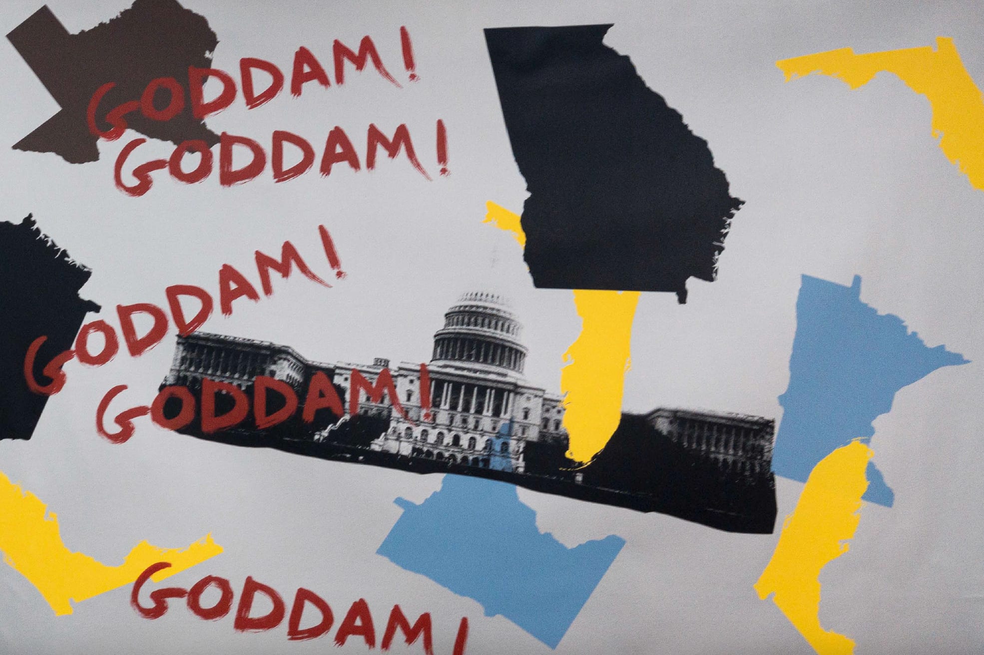 Scott embodies the same rebellious spirit that defined Nina Simone’s life and music. The “High Priestess of Soul,” as she was known, fearlessly performed her songs, especially the 1964 hit “Mississippi Goddam,” even after American states banned and radio stations refused to play her music. Scott argues that the songs continue to resonate today after the murder of George Floyd, the reappearance of stop and frisk, the government stripping women of the right to an abortion, and Florida laws banning the study of Black history. To convey his message in "Goddam" (2021), Scott placed the United States capitol building in the center of the canvas, the words “Goddam, Goddam, Goddam” written over it.