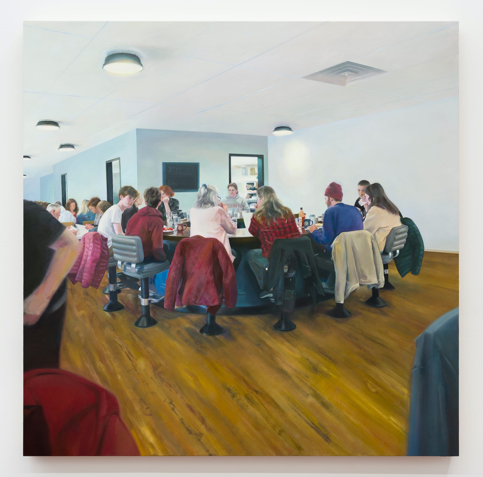 In “Breakfast” (2023), which measures 33 by 33 inches, Lee depicts 10 people seated around a circular restaurant counter, with other diners visible on the left side. Lee’s beautifully observed gathering of White diners defines a world that is not racially diverse. It shares something with Edward Hopper’s “Nighthawks” (1942), an iconic view of four alienated people in an urban diner late at night. However, the differences are more telling than the similarities. In Lee’s painting it is morning and breakfast is being served; the circular counter evokes a vision of camaraderie. The viewpoint is from inside the restaurant, of someone seated at a table, rather than from the street. All of the details culminate in questions, starting with who is part of the circle and who is not.