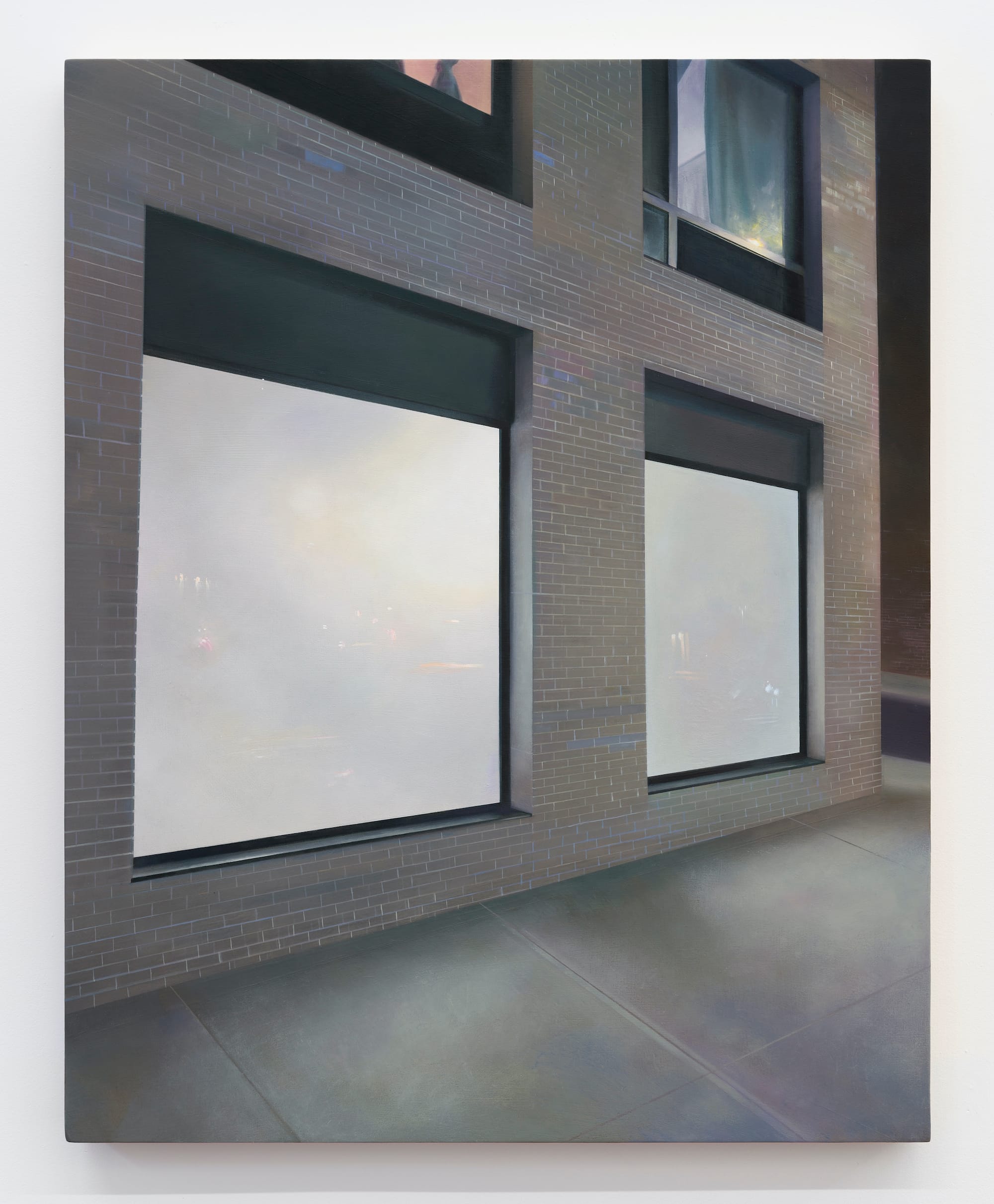 It is the two large, identical street-level windows that demonstrate what Lee can do with paint. Faint reflections of light from passing cars are visible on their surfaces, as well as a diffuse light that seems to come from inside. The reflections are so convincingly painted that I found myself staring at something I might not have noticed in real life. Through her attention to detail, lighting, and the color of the second-floor rooms, Lee transforms a banal view into something uncanny. Nothing in the painting seems forced; it is as if she saw this scene in a dream.