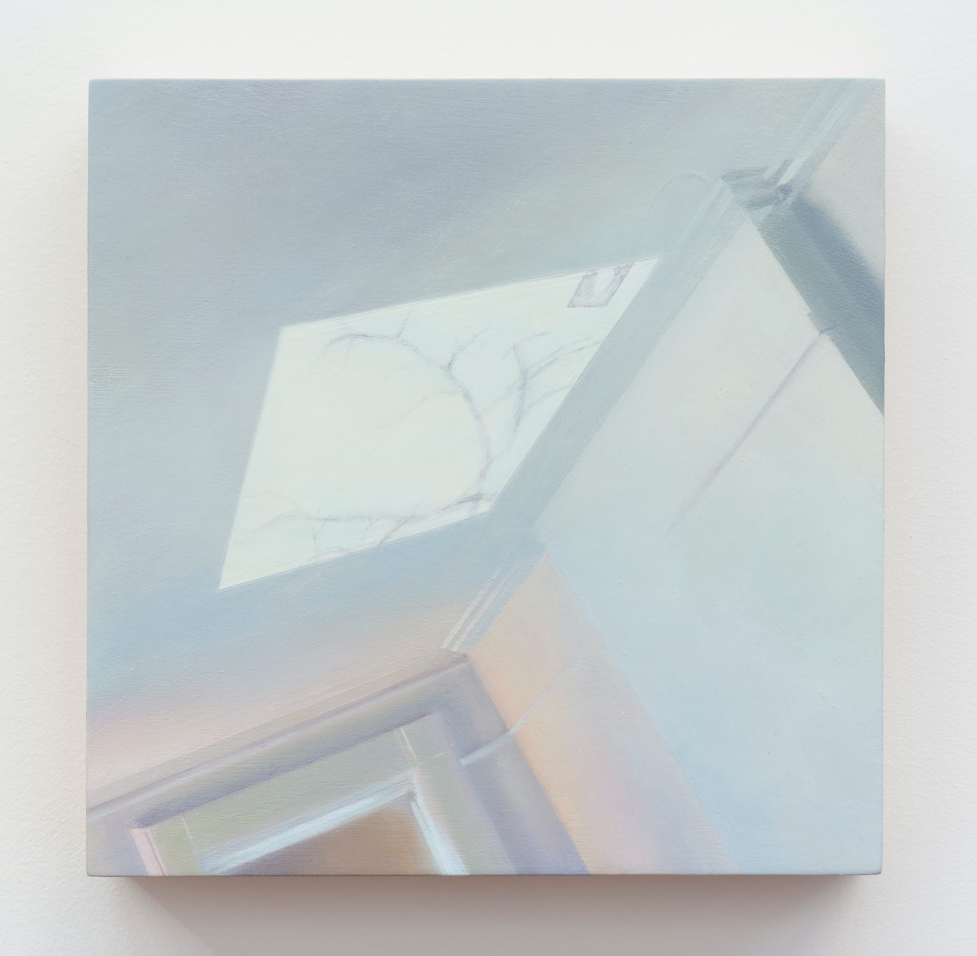 “Studio Light” (2023), which measures eight by eight inches, takes Lee’s interest in light to another level. Working in a tonal palette of bluish-white to pale blue, tempered with whitish orange, Lee depicts a disorienting perspective, cropping the view so that nothing is quite clear. We are not even sure where we are standing in the room. I was completely mesmerized by this painting.