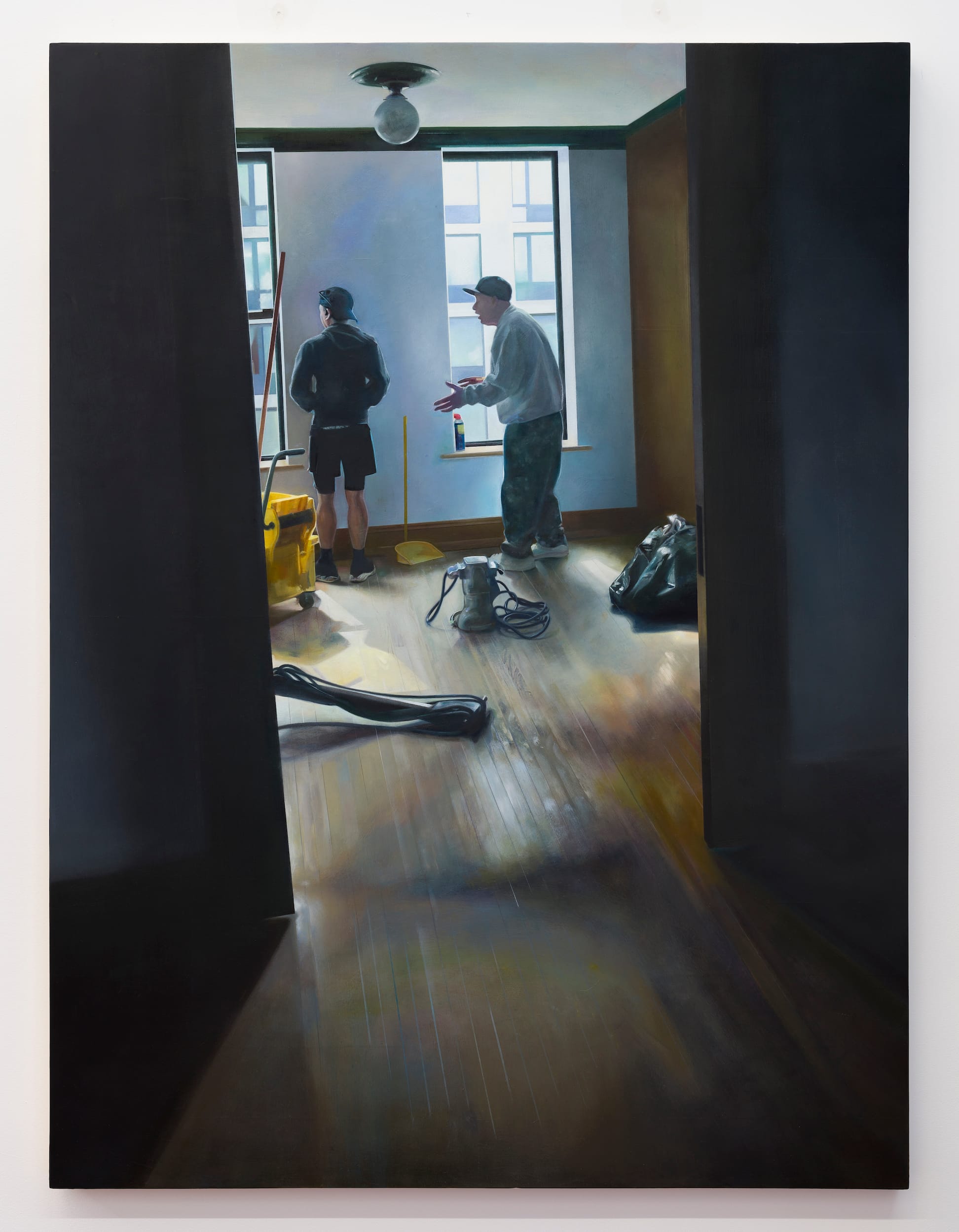 At the same time, Lee’s painting speaks to the upgrading of tenement apartments, and the ensuing gentrification. As with Caillebotte’s three workers, the two men standing in this modest apartment most likely could not afford to rent or buy it. Lee devotes her attention to the afternoon light diffusing in the room, the uneven coloring of the floorboards, the pale blue and brown walls, and the yellow janitorial mop bucket and dustpan. Her desire for verisimilitude in focusing on the tools and workers rejects moralizing or social messages without becoming didactic.