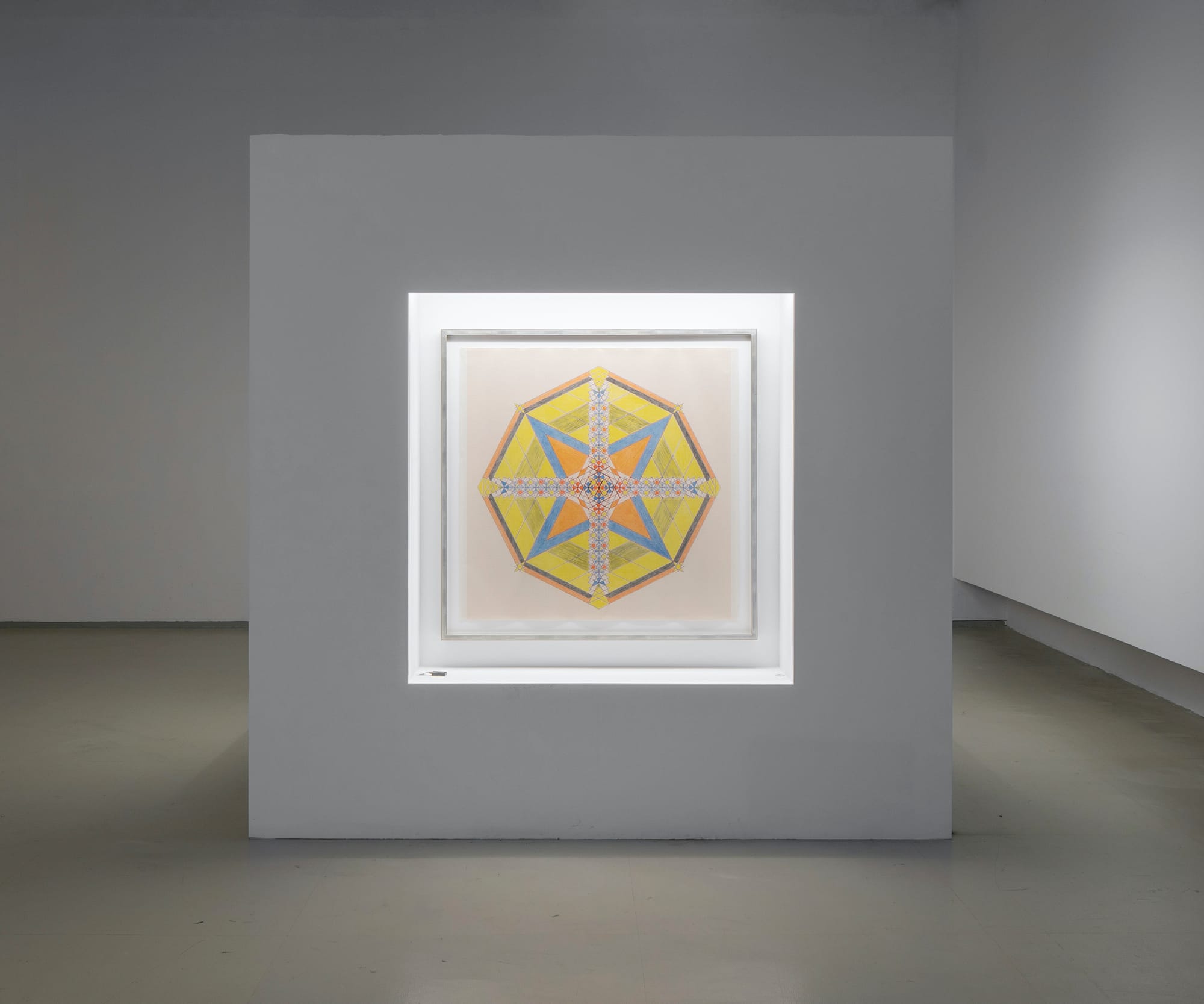 Recurring themes meander through the “palaces”: beyond space travel (Jonas Staal’s monumental piece in the Power Station’s chimney, titled “Exo-Ecologies,” 2023, is an interspecies “launch pad”) are works addressing early human myths and systems — Saodat Ismailova’s two-channel video “Two Horizons” (2022) dreamily sets a young boy in a haunting Central Asian landscape and melds the story of the famous Soviet spaceport in what is now Kazakhstan with an old prophecy of a person who can defy gravity and achieve immortality. Michel Seuphor’s 64 line drawings representing hexagrams from the I Ching — arranged in a huge half-circular vitrine — are each labelled with heady slogans like “solidarity” or “the strength of the lonely man.” There are dashes of esotericism, too: Emma Kunz’s colorful geometric “energy field” drawings from the 1930s are powerfully vibrating mandalas (the healer claimed her art was not for her time, but rather for the 21st century), and Nolan Oswald Dennis’s wall drawings meld African belief systems and astrology.