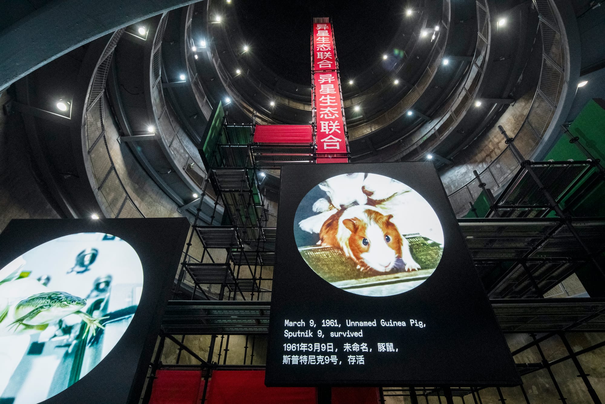 SHANGHAI — In the early 1980s, when I was a girl intrigued by science and space, I raptly watched the 13-episode documentary Cosmos on American TV. Hosted by the charismatic astronomer Carl Sagan, it connected science and civilization, explored the possibility of extraterrestrial life, and deepened cosmic curiosity in a public still in the throes of humankind’s then-recent journeys to the moon and beyond. In the soaring entrance of the 14th Shanghai Biennale, titled Cosmos Cinema and on view in the city’s vast Power Station of Art contemporary art center, I experienced a flash of nostalgia for that time, perhaps an escape from today’s dire earthly conditions. Within that first darkened space, Trevor Paglen’s silver “Prototype for a Nonfunctional Satellite (Design 4; Build 4)”(2013) hangs as an illuminated, mirrored globe — shiny and pure.