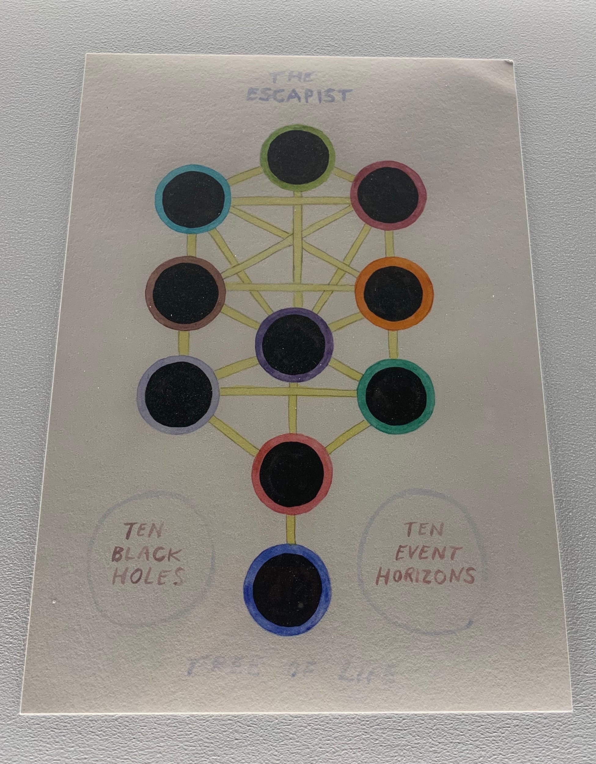 With more than 80 artists, 200 works, and so much time-based art, seeing all of Cosmos Cinema is a commitment, but one of the show’s core questions is how time and space stretch, fold, wrinkle, and collapse into each other; one line in Raqs Media Collective’s video “The Bicyclist Who Fell into a Time Cone” (2023) states that “things might vanish from history, but they do not vanish from time,” while Suzanne Treister, in a fascinating series of comic-like drawings called The Escapist BHST Black Hole Spacetime (2018–19), asserts that “time is a drug.”