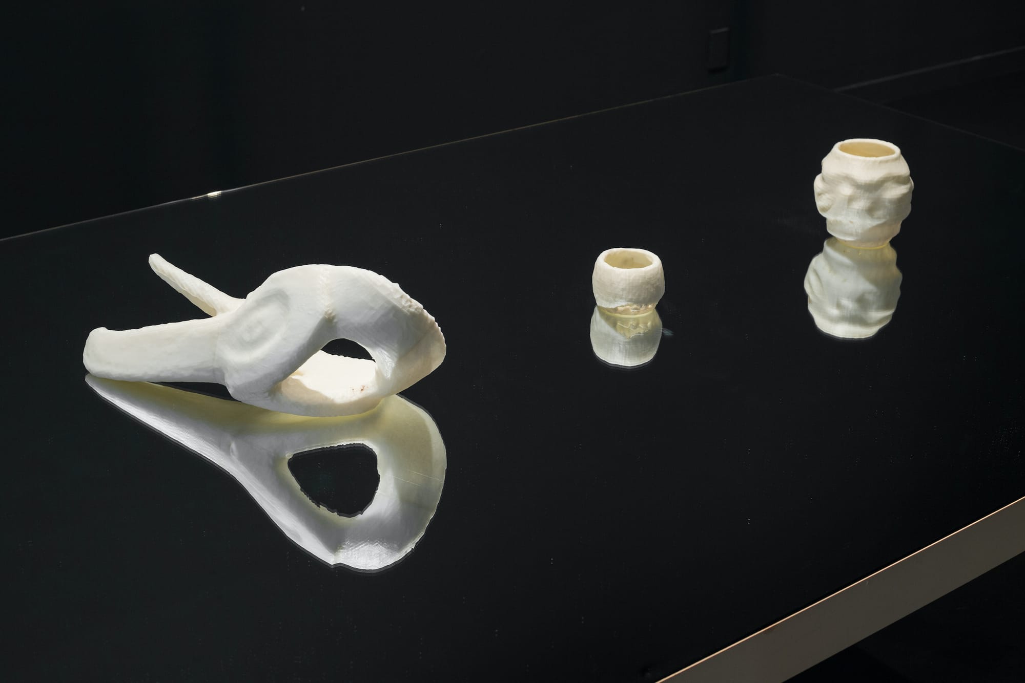 Linklater manifests the violence committed against Indigenous North Americans by Western institutions most explicitly — with a gutting mixture of coolness and poignance — in projects responding to the ways in which Native artifacts have long been collected by outsiders. What’s here are the ghostliest, crappiest of copies: off-white ABS plastic versions of masks, pots, a figurine, and a mini totem pole from a hodgepodge of cultures, marred by seams, doubled by the mirrored surfaces of the tables on which they are arrayed. The originals, belonging to the Utah Museum of Fine Arts, have undergone practices that are abhorrently typical: individual authorship never recorded, objects considered animate by their tribes stored away as if dead, diverse cultures grouped into simplistic cultural categories. Linklater’s bad copies won’t make anyone feel better, nor should they as they register the alienation and loss that museums and collectors have long perpetrated in their pursuit of interesting objects.