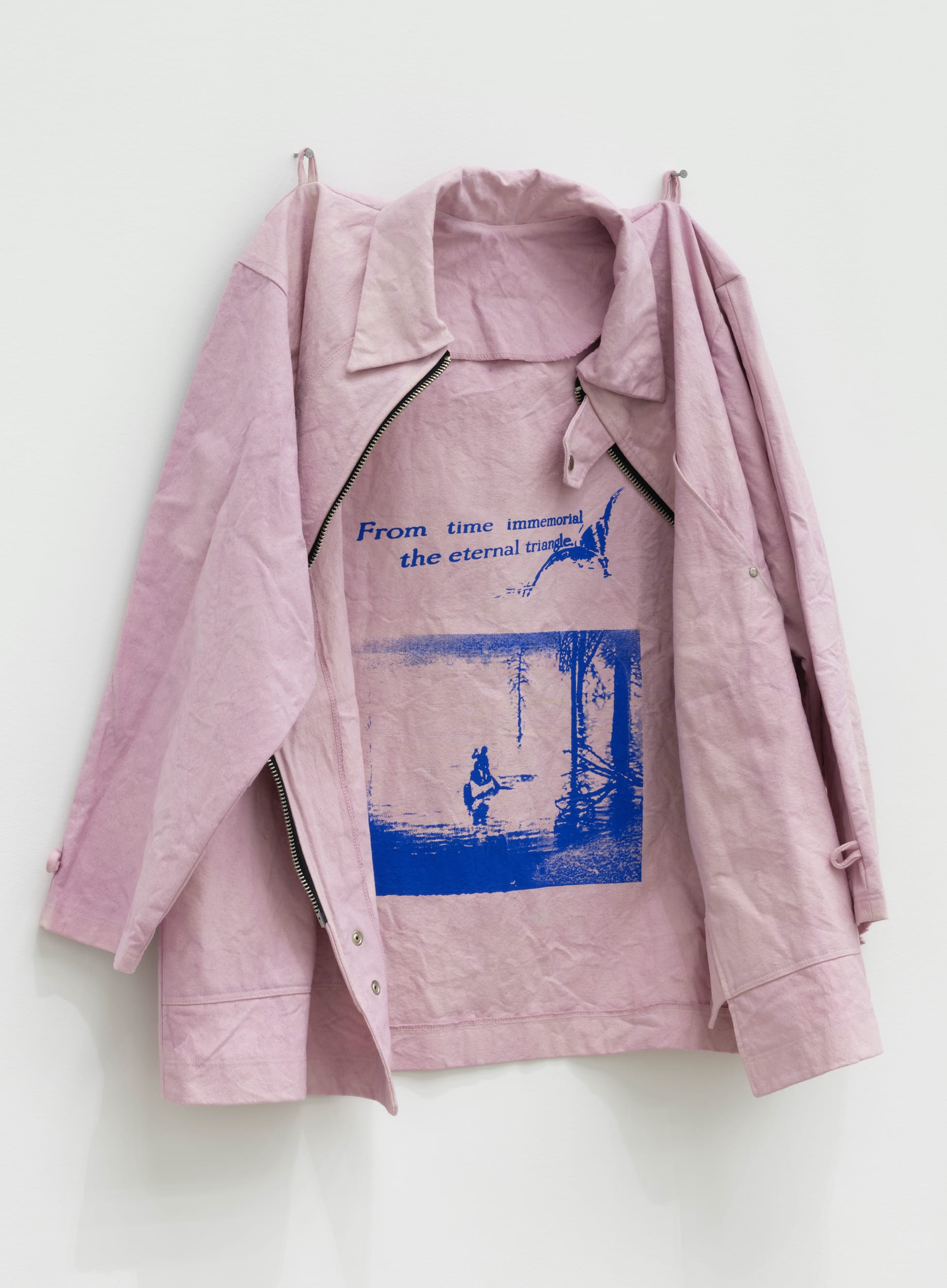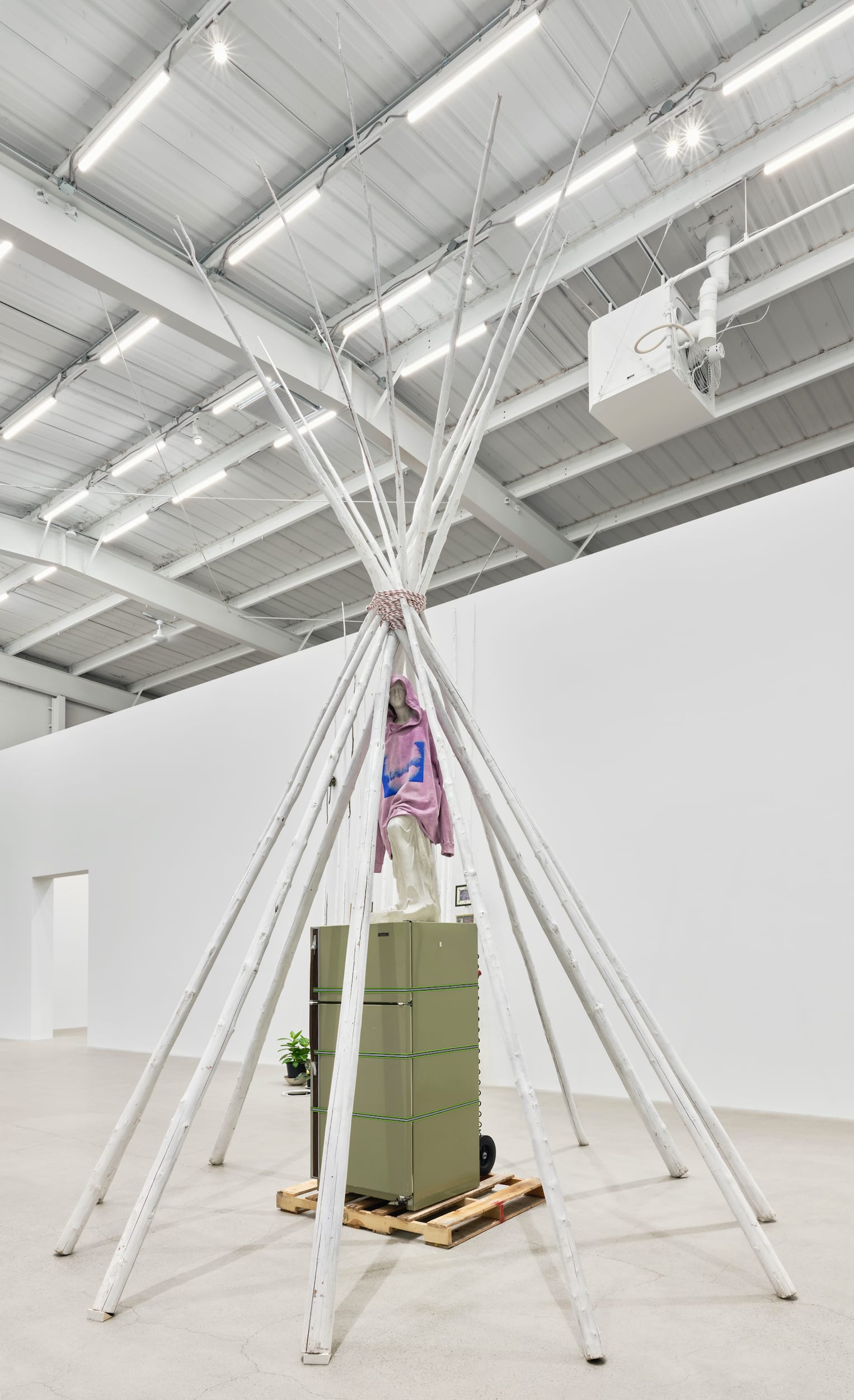 The tepee is one of two on view in mymothersside, Linklater’s solo exhibition at the Museum of Contemporary Art Chicago. Also included are eight more tepee covers, a bundle of tepee poles, 3-D printed and re-photographed Indigenous artworks, a trio of furs, an old avocado-colored refrigerator, an oversized hoodie dyed with cochineal and worn by a knockoff Greco-Roman statue from Wayfair, a banner touting both The Cure and the American Indian Movement, and a couple of videos, one made in reference to Yvonne Rainer, another to the easternmost point of land in North America.