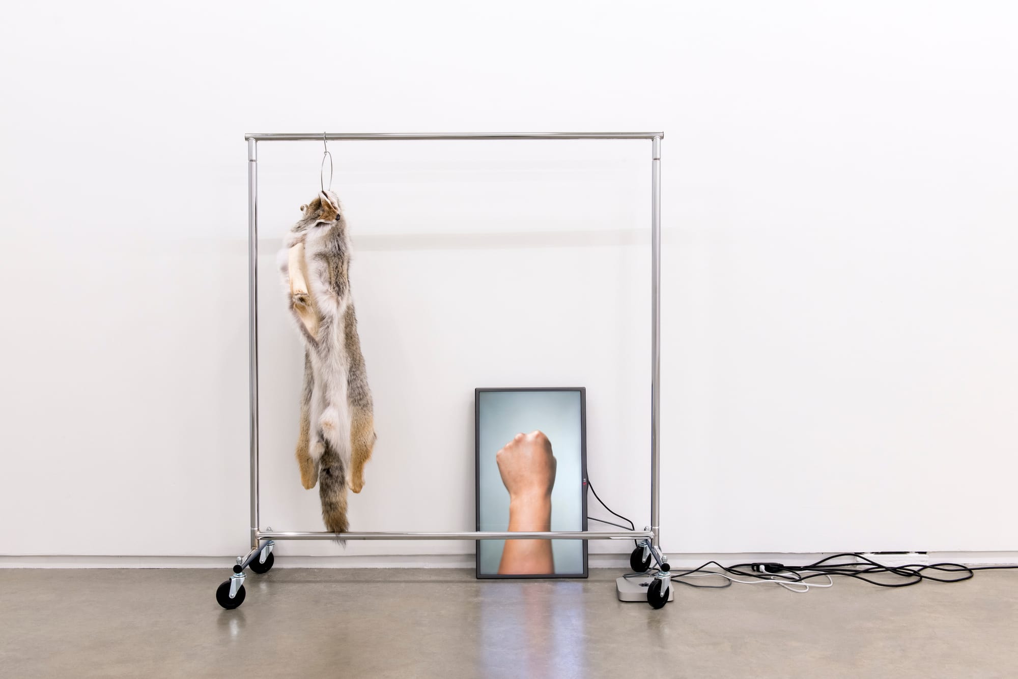 That insistence on the importance of family and community, so rare in the art world, explains both the exhibition’s title and some of the more social aspects of Linklater’s materials. His tepee cover paintings — half-circles of stitched-together linen panels up to 20 feet in diameter and featuring stake loops, central smoke flaps, and door cut-outs; printed with pre-contact geometric patterns and the European floral designs that largely replaced them; and alternately displayed folded, hung, or draped — are colored with dyes derived from sumac, dandelion, black walnut, iron oxide, and other regionally sourced minerals and pigments, as introduced to him by Ojibwe artist Anong Beam. The sapling poles used in the monumental sculpture “what grief conjures” — at its center stands the hooded statue, atop the green fridge, atop a hand truck, atop a shipping pallet — were harvested and prepared with the help of friends affiliated with Dokis First Nation; a video, not on view at the MCA, shows family members moving amid the structure to a score composed by the artist and his son, Tobias. The coyote pelt hung on a garment rack in “The place I seek to go” was bought at Fur Harvesters Auction, a long-established business in North Bay where Linklater’s grandparents once sold furs and where members of his extended family continue to do so. “Modest Livelihood,” a meditatively silent and slow film that will play during the second half of the show on the wall above the gallery entrance/exit, follows Linklater and Dane-Zaa artist Brian Jungen hunting moose with Jungen’s uncle, elder Jack Askoty, on Dane-Zaa territory in northern British Columbia.