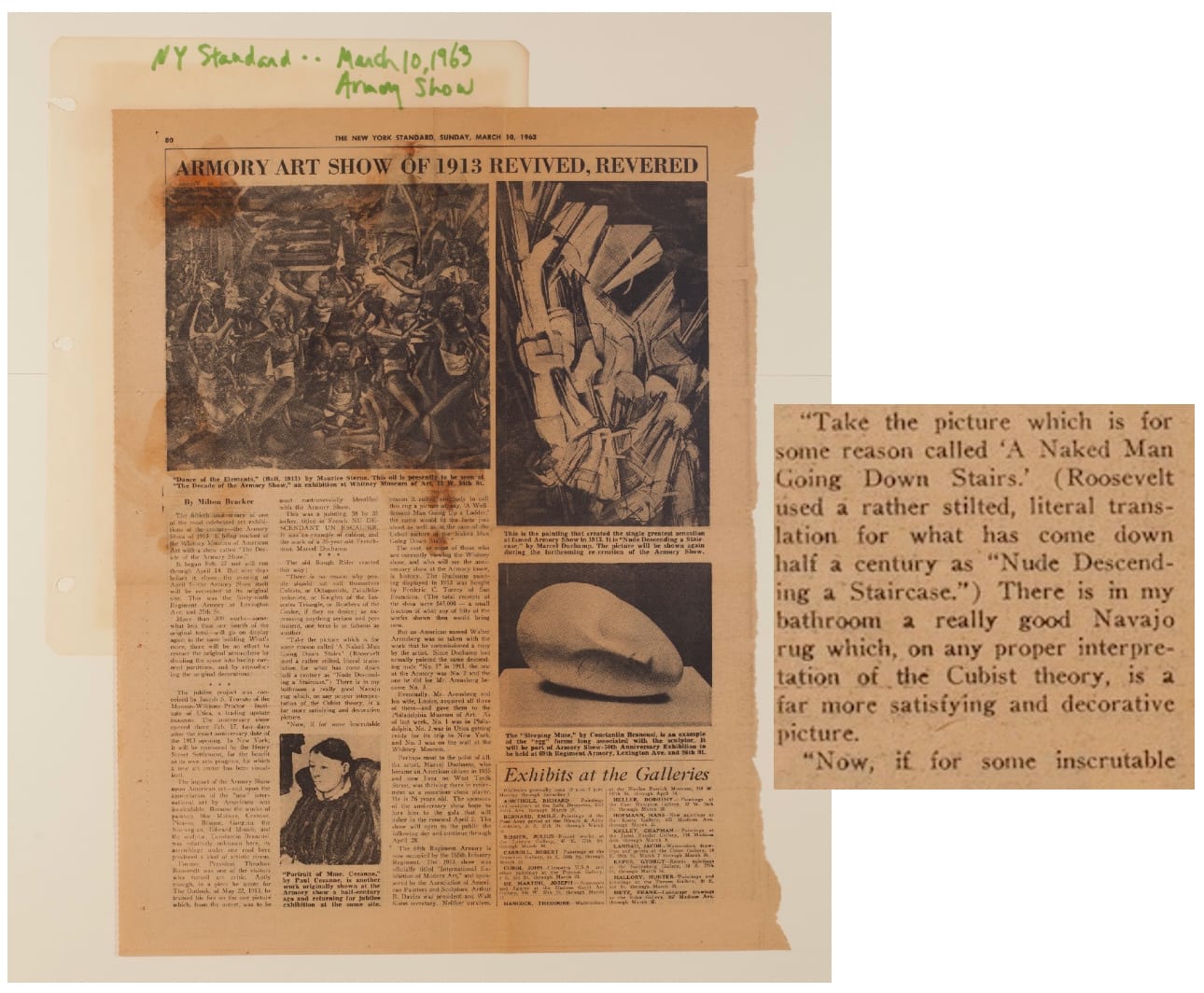 "There is in my bathroom a really good Navajo rug which, on any proper interpretation of the Cubist theory, is a far more satisfying and decorative picture," Roosevelt continued. "Now, if for some inscrutable reason it suited somebody to call this rug a picture of, say, ‘A Well-dressed Man Going Up a Ladder,’ the name would fit the facts just about as well as in the case of the Cubist picture of the ‘Naked Man going Down Stairs.’” The quote is cited in an article about a 1963 exhibition commemorating the 50th anniversary of the Armory Show, which is preserved in the new portal.